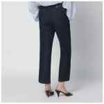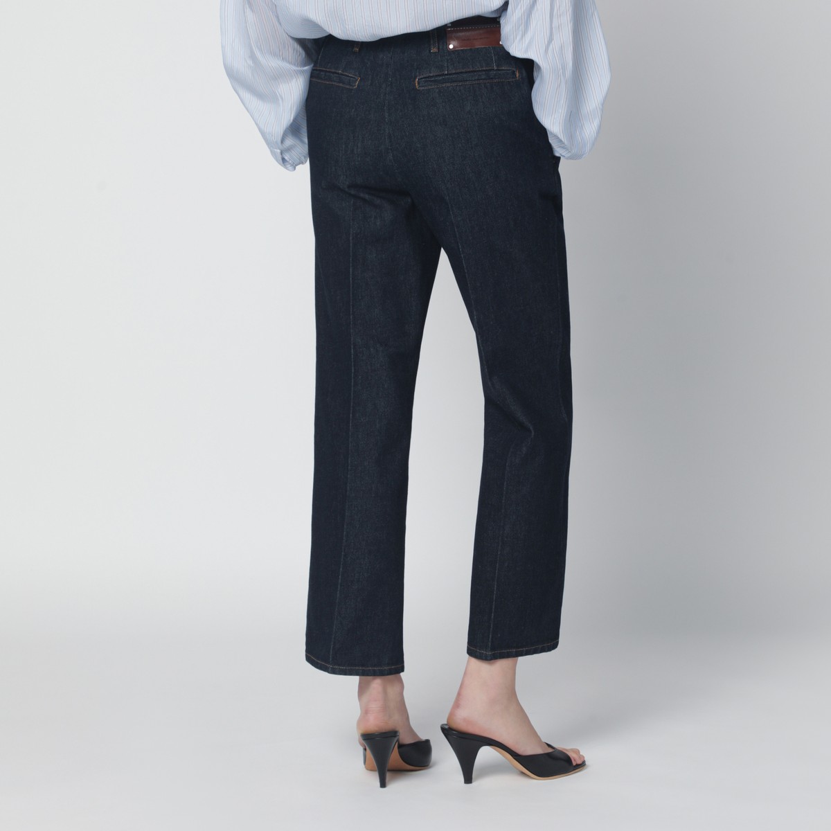 Indigo blue cotton denim trousers by Dries Van Noten, featuring belt loops, front closure, front crease, two side pockets, two rear welt pockets, logo patch on the back and contrast stitching.