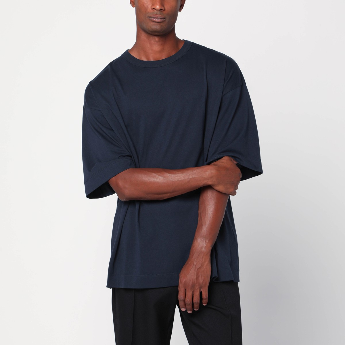 Wide T-shirt by Dries Van Noten in navy blue cotton, characterized by short sleeves, ribbed crew neck, and dropped shoulders.