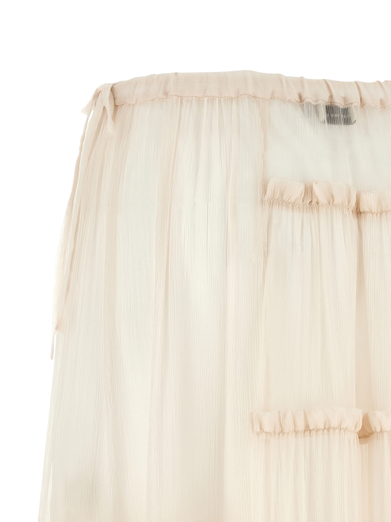 ‘sunia bis’ long skirt in semi-transparent washed muslin silk with ruffles and ruffles, Slip-on model, Drawstring at the waist, Asymmetrical hem with train, Removable lining.