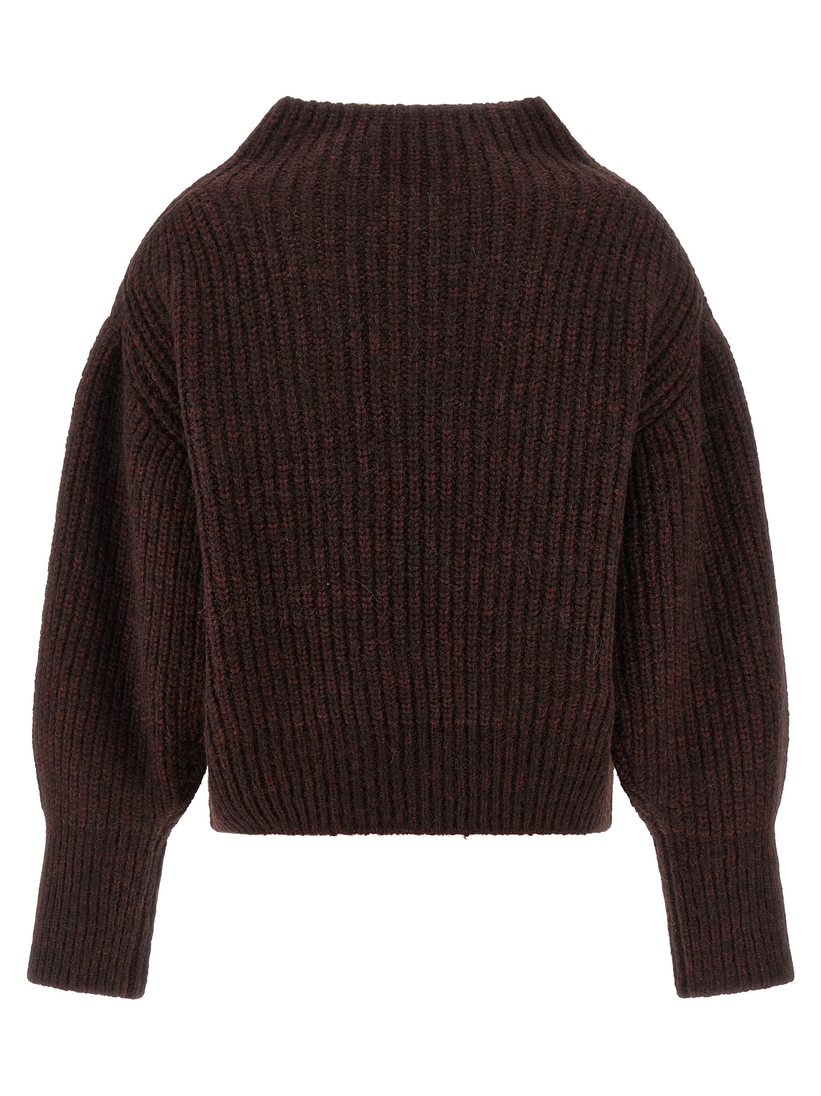 Teubina’ two-tone knitted wool and alpaca sweater, high neck with pleat and jewel detail, long wide sleeves with dropped shoulders.