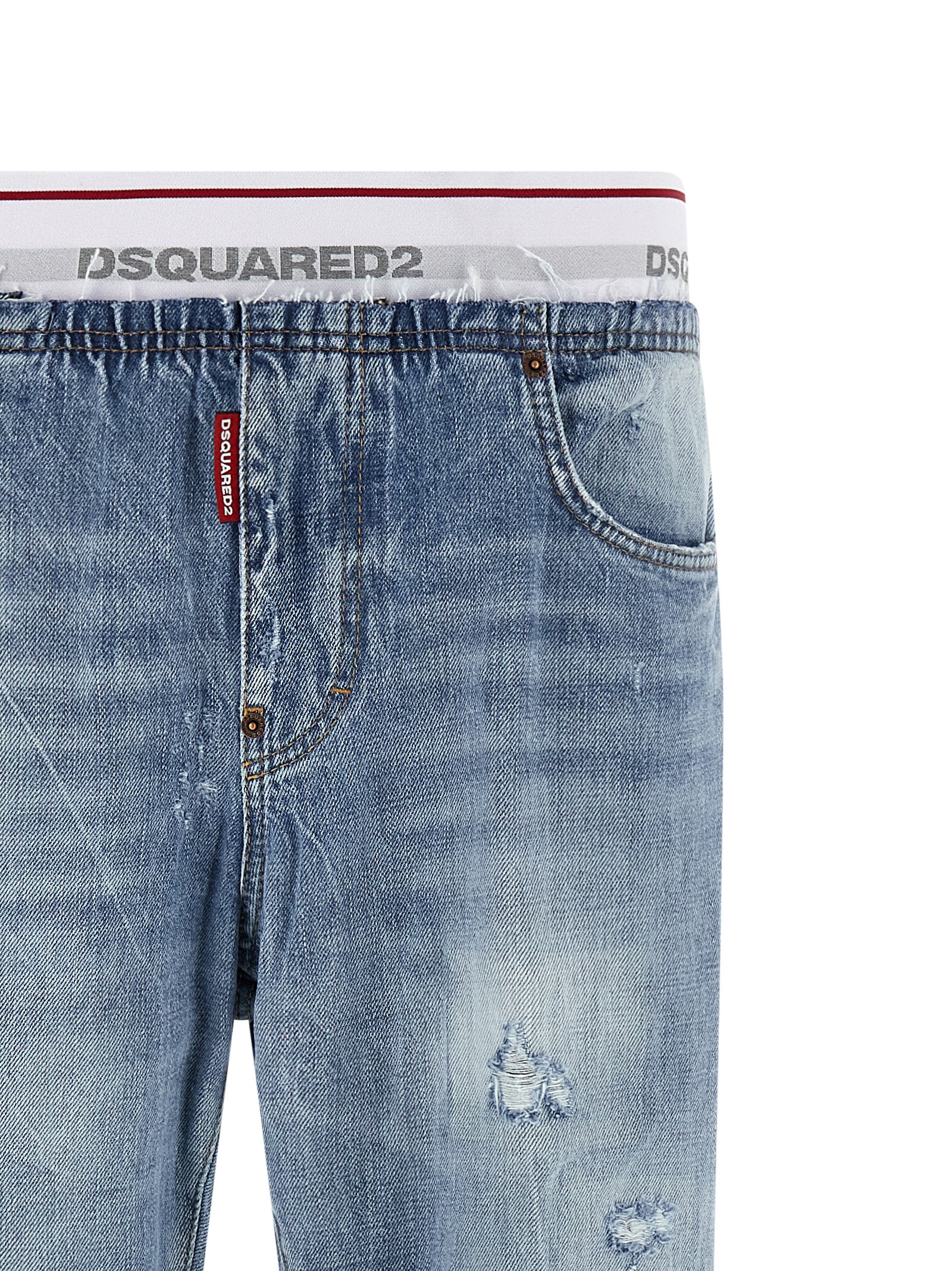 ‘denim jogger’ 13.5 oz stone washed stretch cotton denim jeans with destroyed details, Contrast stitching, Elastic insert with jacquard logo at the waist, Pull-on model, Trompe l’oeil flap, Five pockets.