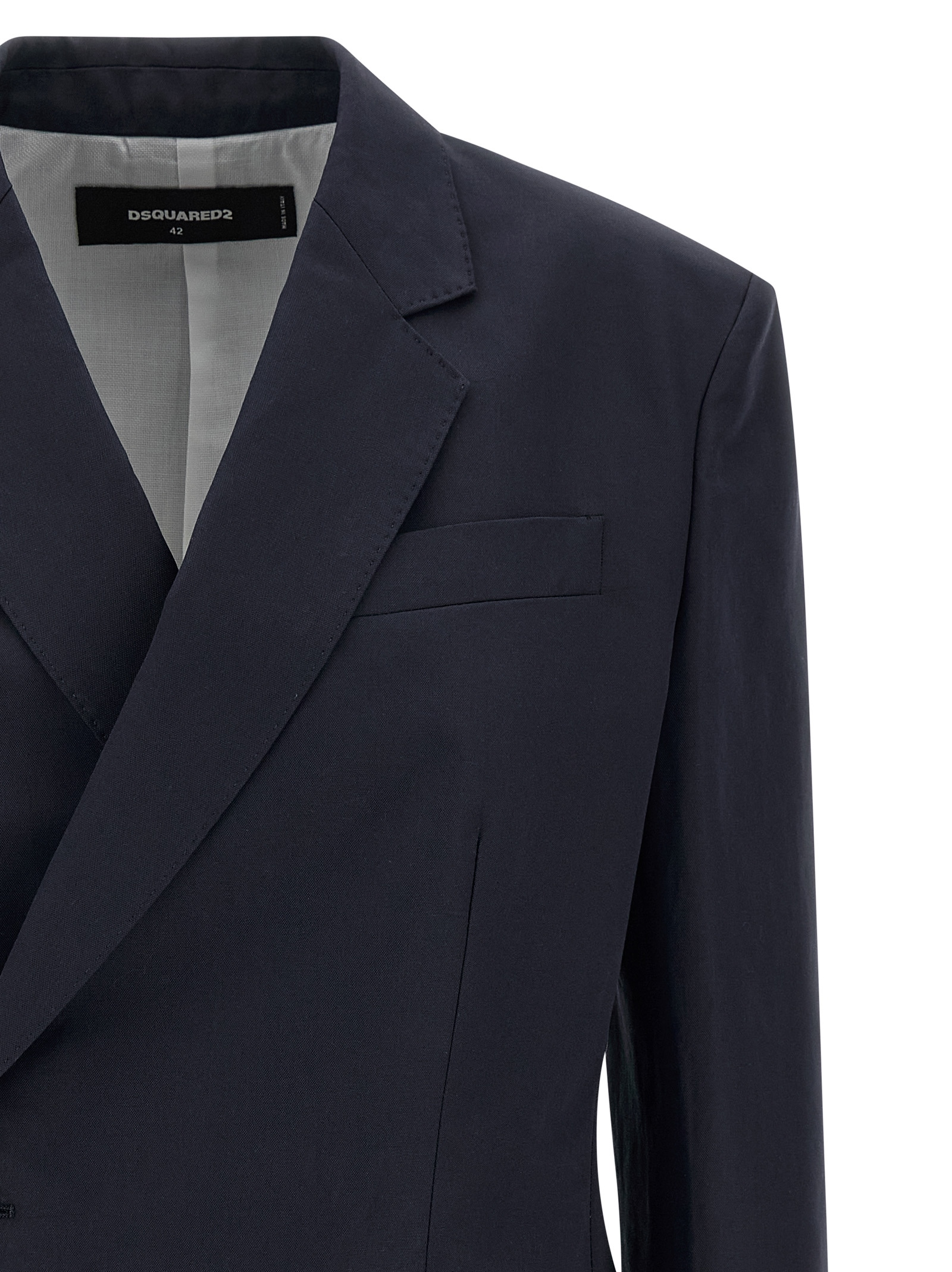 ‘Kathy’ double-breasted cotton gabardine blazer with front button closure, mirror lapels, breast pocket, flap pockets, structured shoulder strap, long sleeves, back vents.