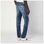 Dsquared2 slim jeans in medium blue cotton denim with a faded effect, characterized by a front closure with button and zip, belt loops, five classic pockets, back logo patch, localized rips, splatter details, and front logo tag.