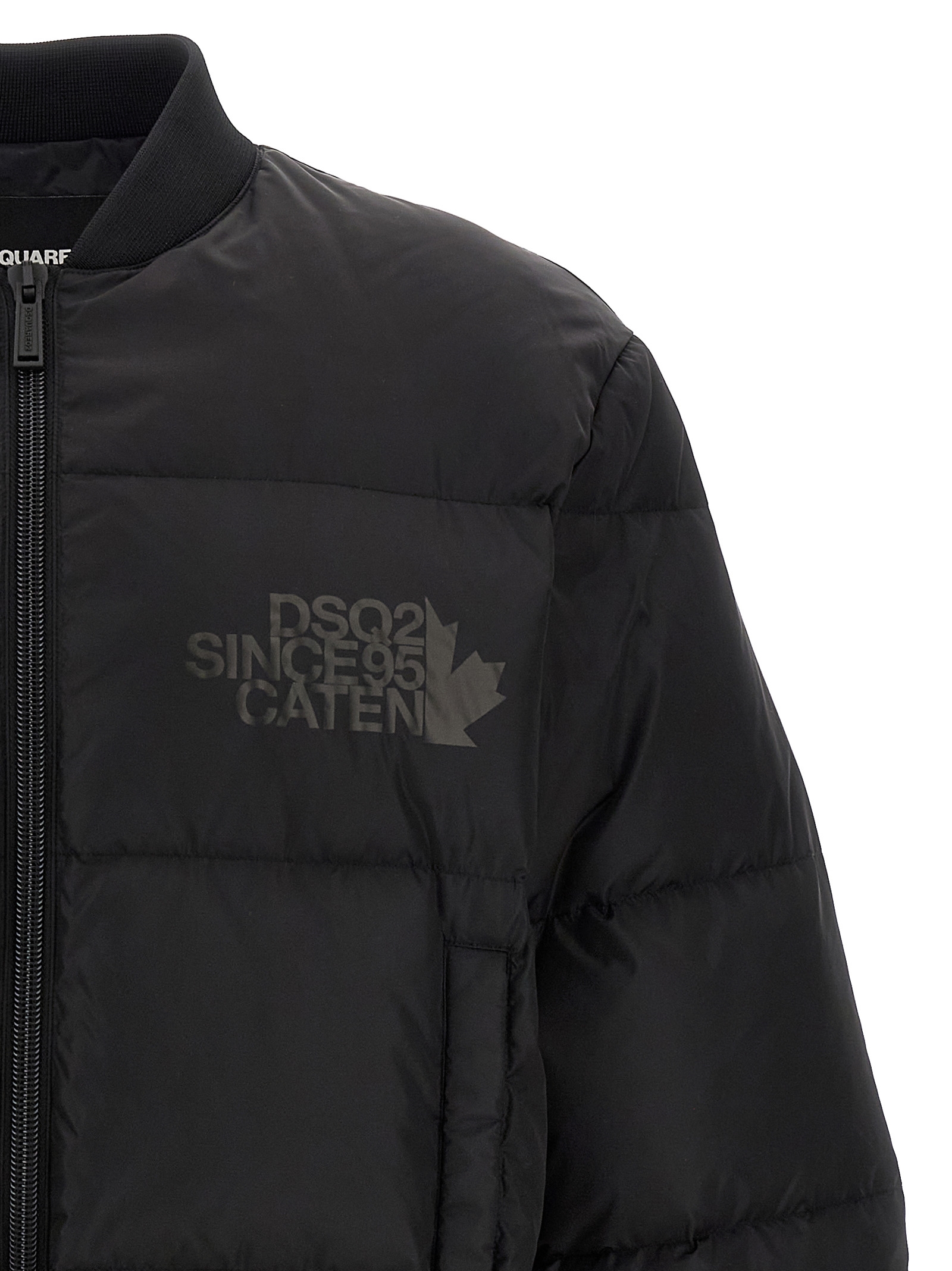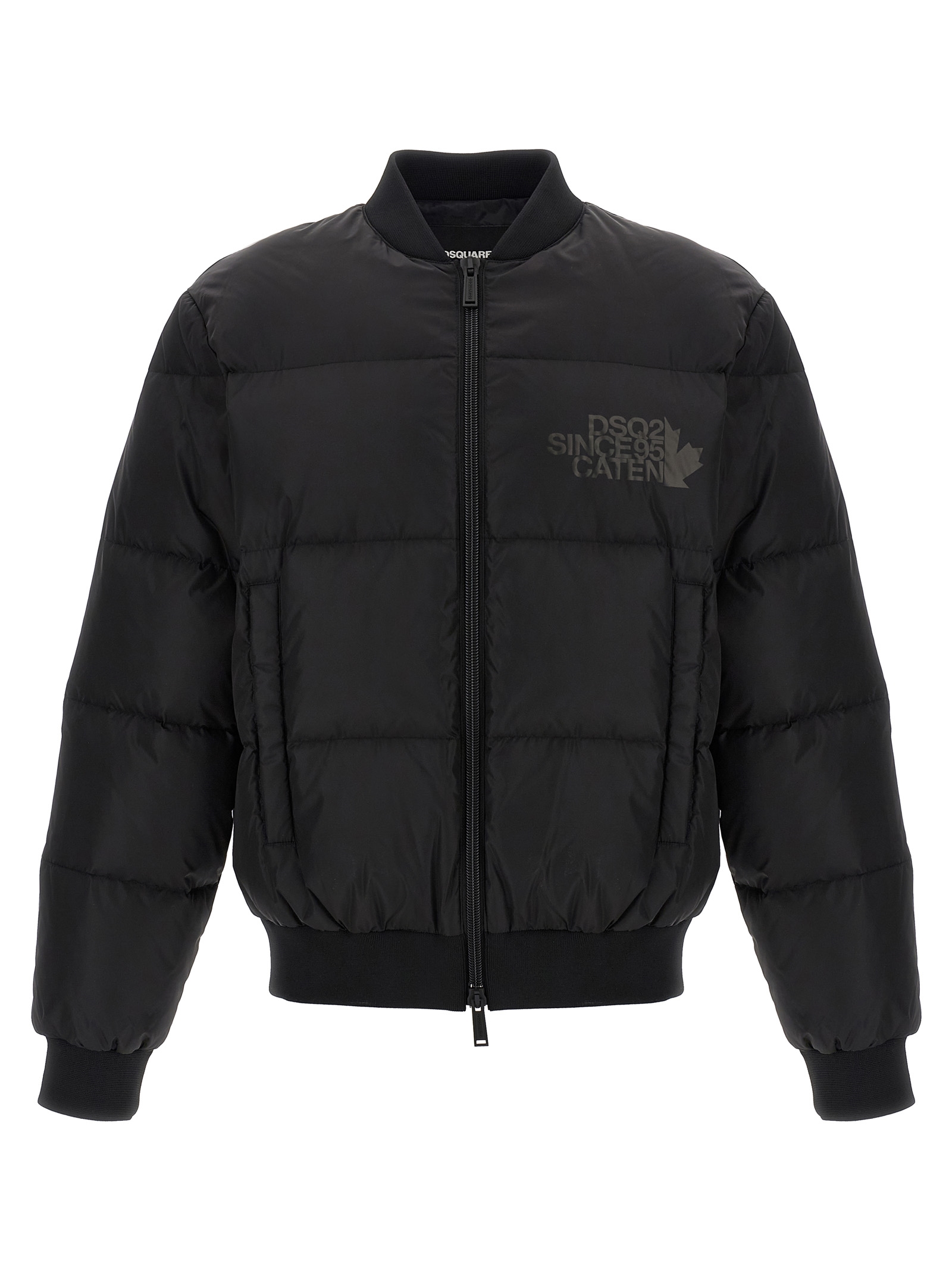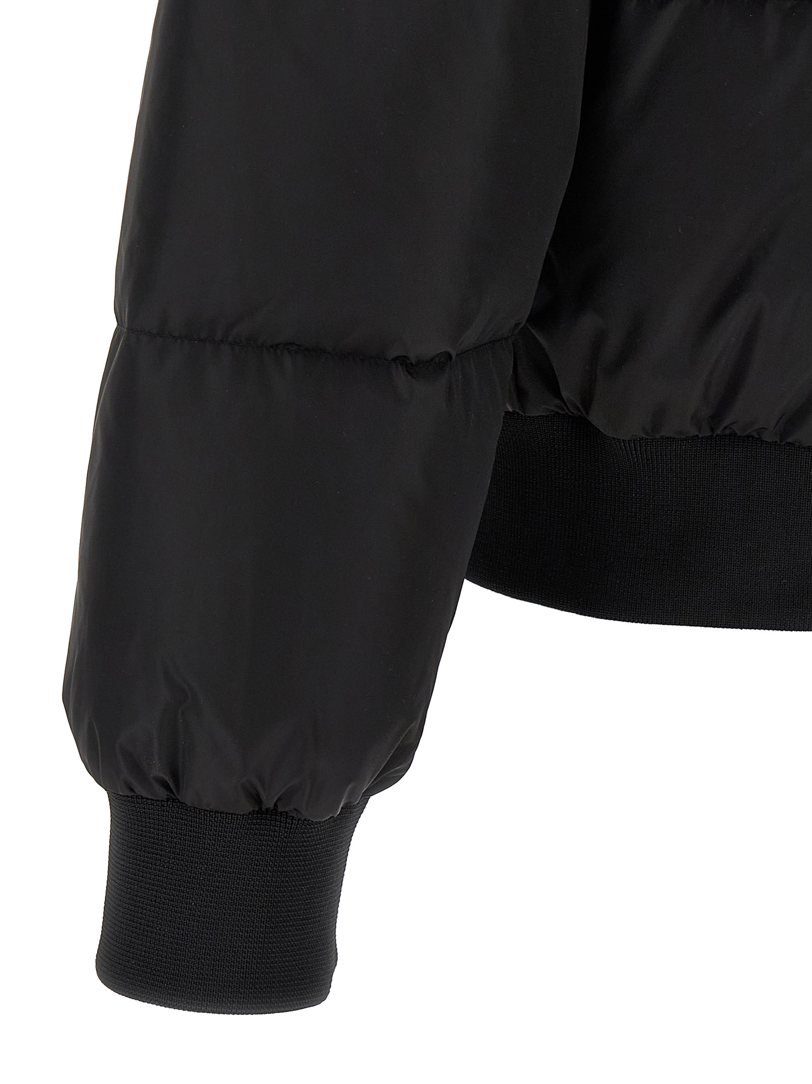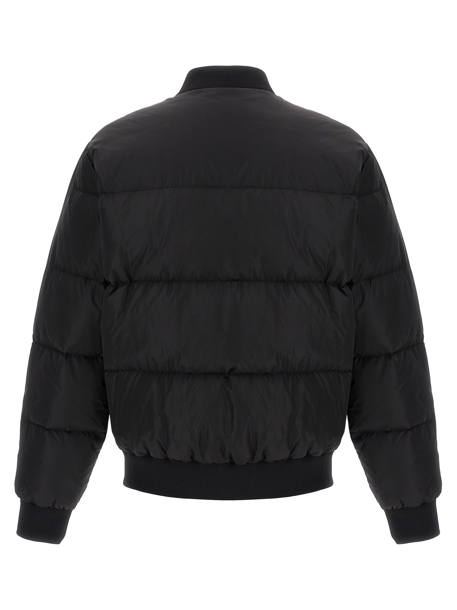 Padded bomber jacket, front zip closure, embossed side logo print, knit details, long cuffed sleeves.