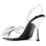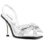 bow-detail sqaure-toe sandals from DSQUARED2 featuring silver-tone, calf leather, crystal embellishment, bow detailing, open toe, square toe, single toe strap, elasticated slingback strap, branded footbed and high heel. Rhinestone details heel sandals