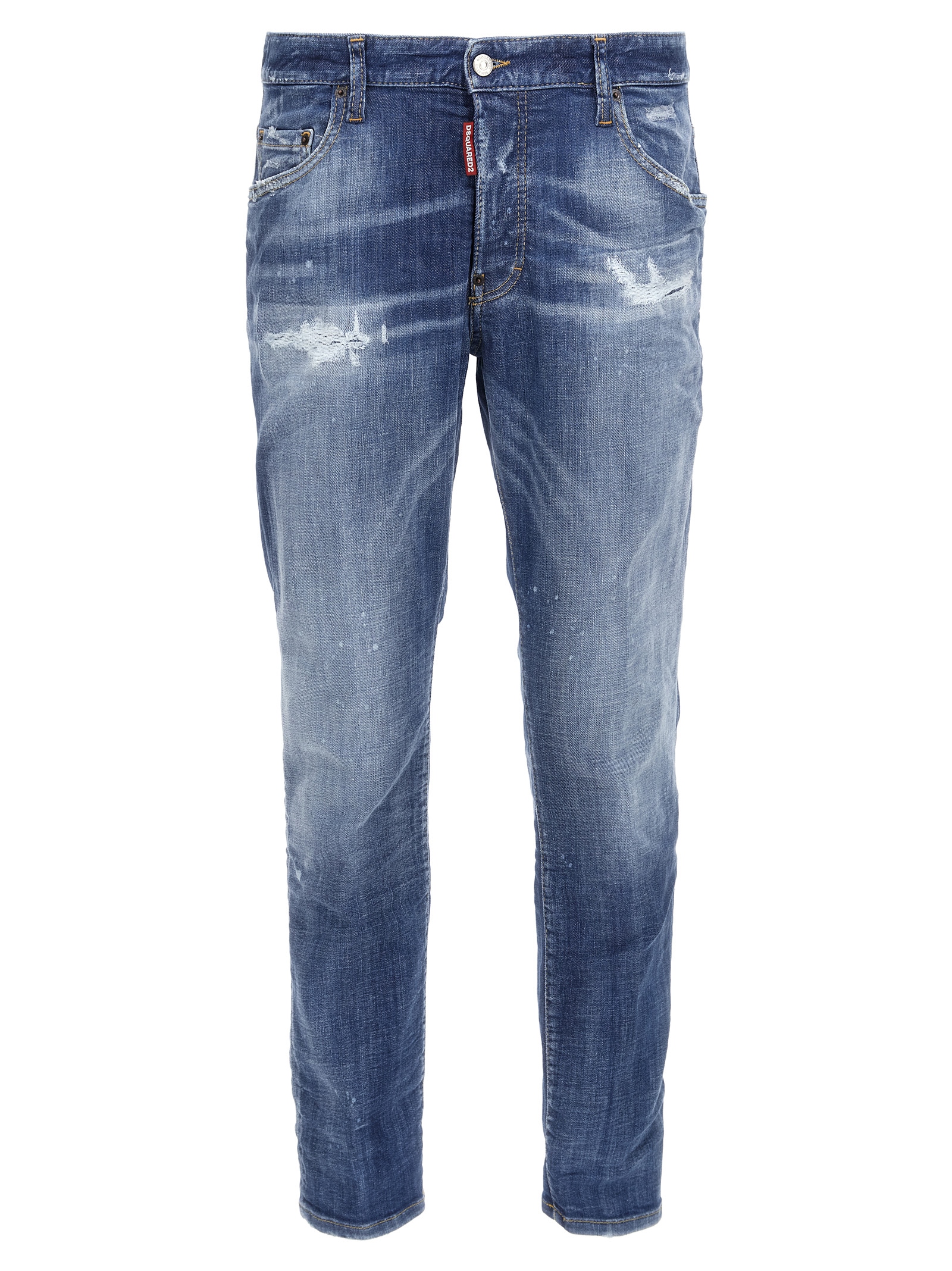 ‘Skater’ stretch cotton denim jeans with used-effect details and small rips, five pockets, button closure, felt logo label on the back.