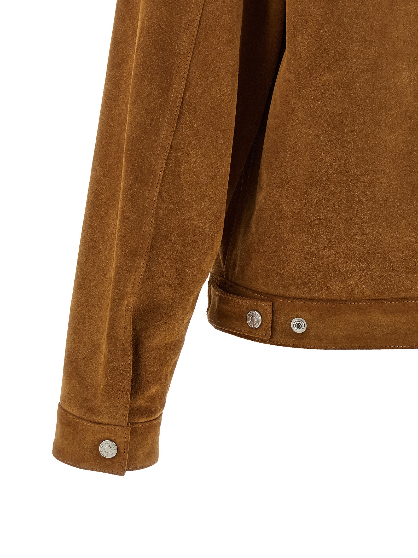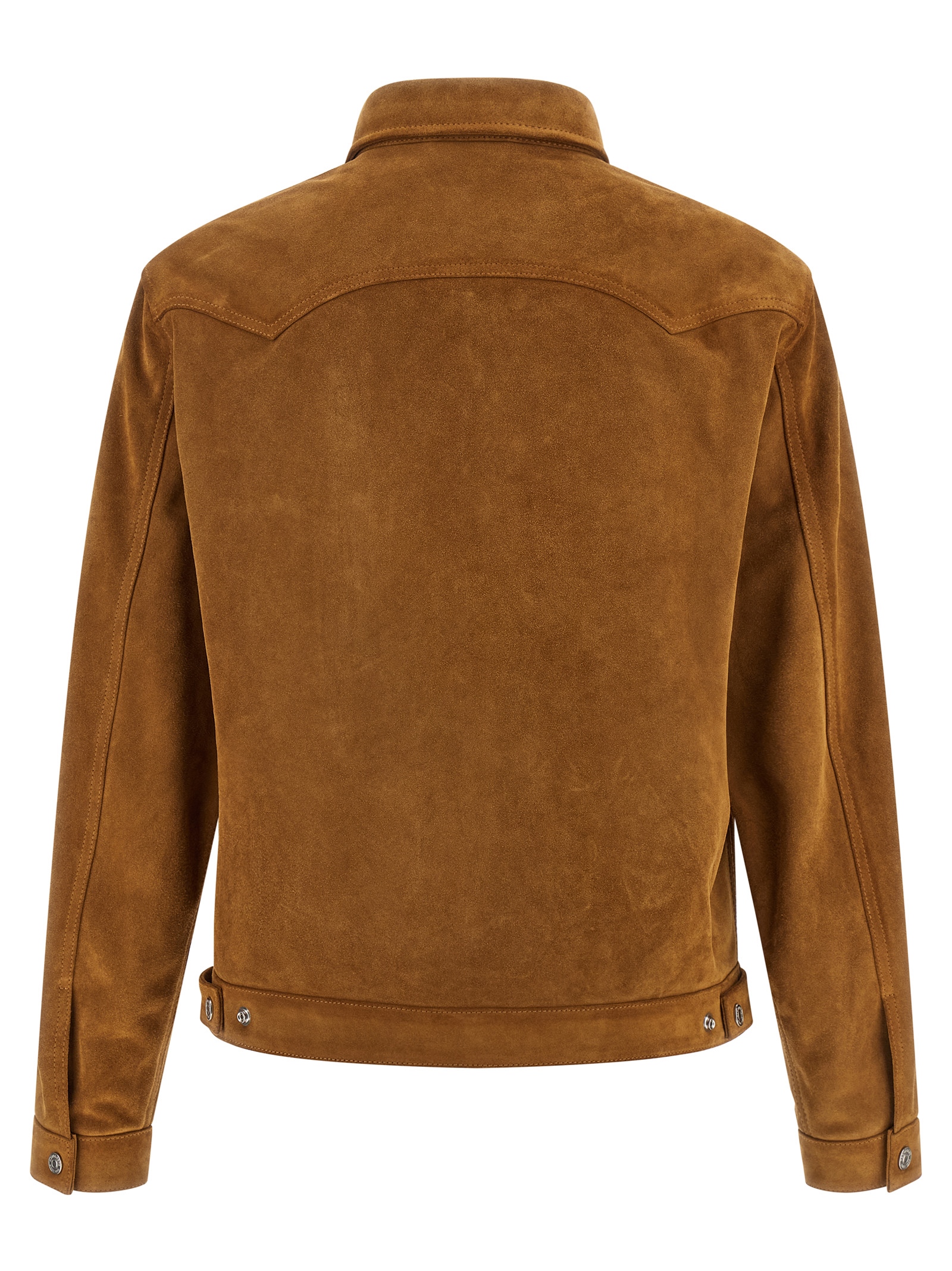 ‘Suede Boxy Shirt’ suede jacket with Western style shirt style, front snap button closure, pockets, long cuffed sleeves, unlined.