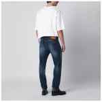 Dsquared2 medium-wash blue stretch cotton denim jeans, featuring front zip and button closure, paint-splatter design, vintage treatment and distressed details, belt loops, five classic pockets, red logo lettering tag on the front and rear logo patch.