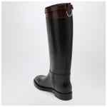 Durazzi Milano boots in two-tone black and burgundy calf leather, featuring engraved D-Ring logo detail, removable strap, high shaft, and leather sole.