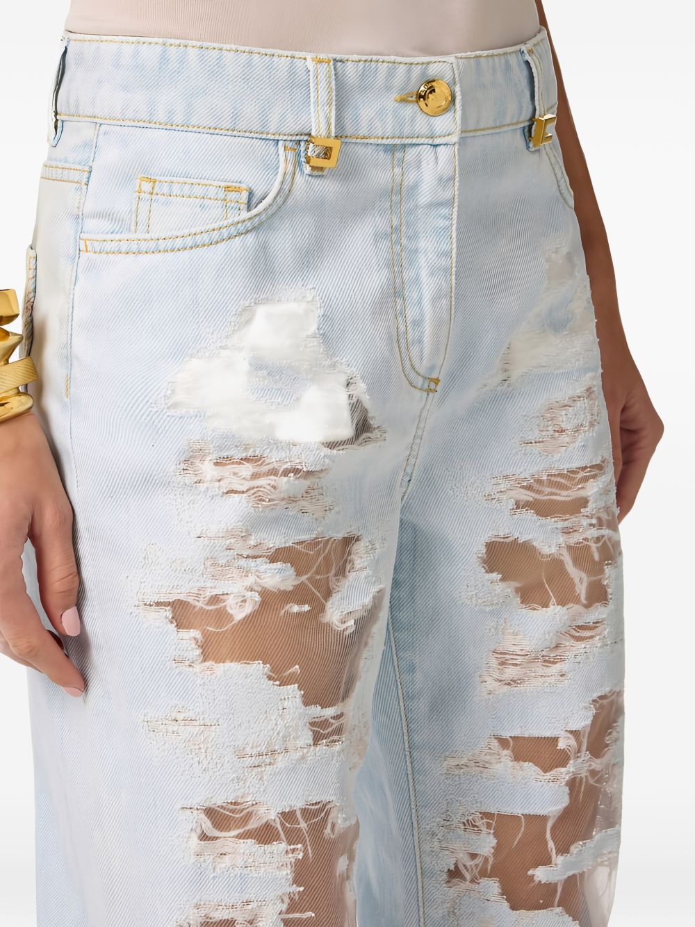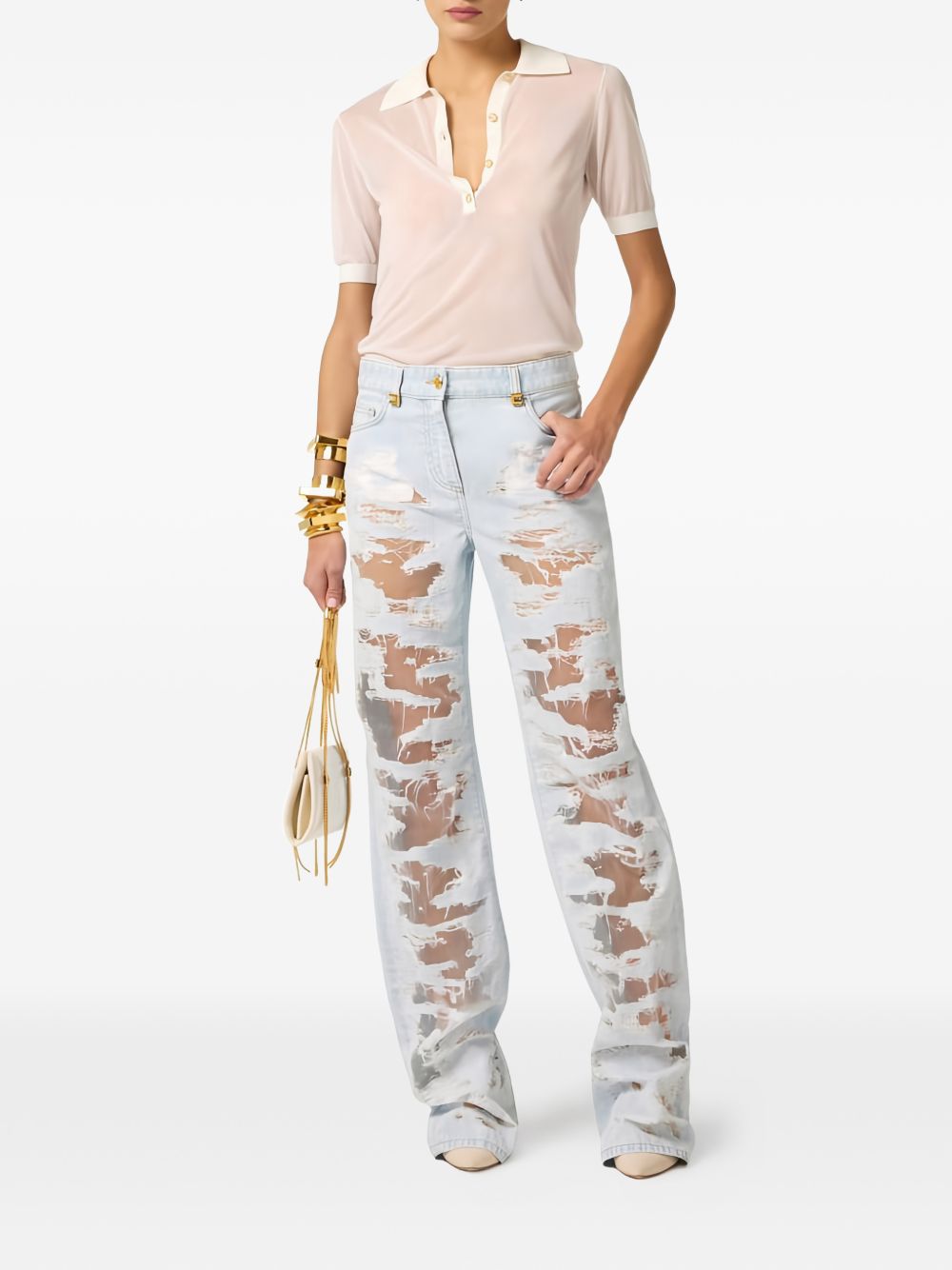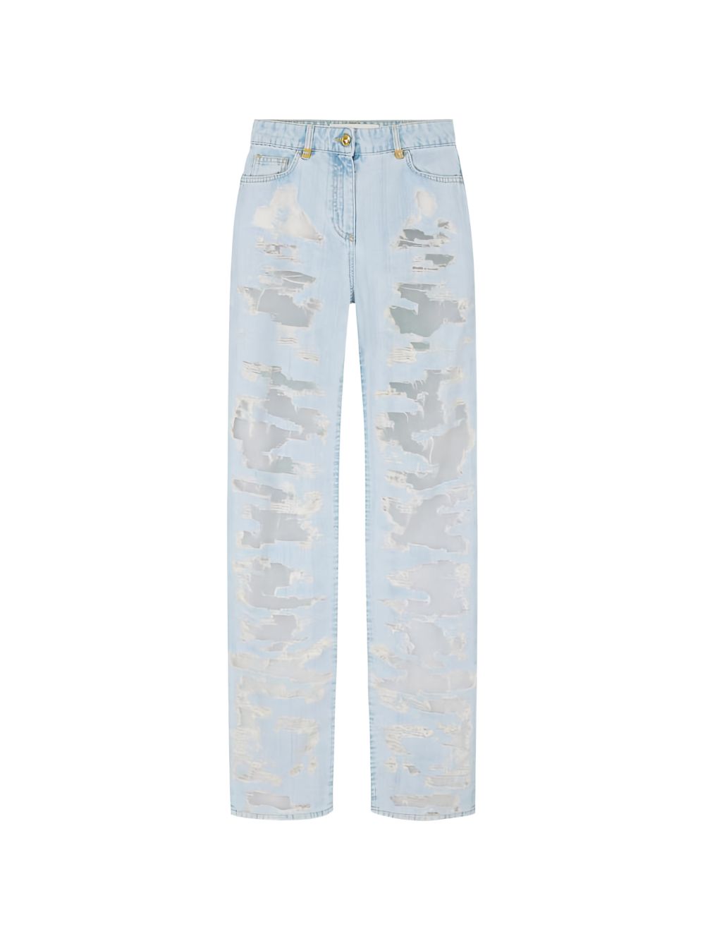 light blue distressed effect golden metal logo loops palazzo leg back pocket Denim cotton jeans.
