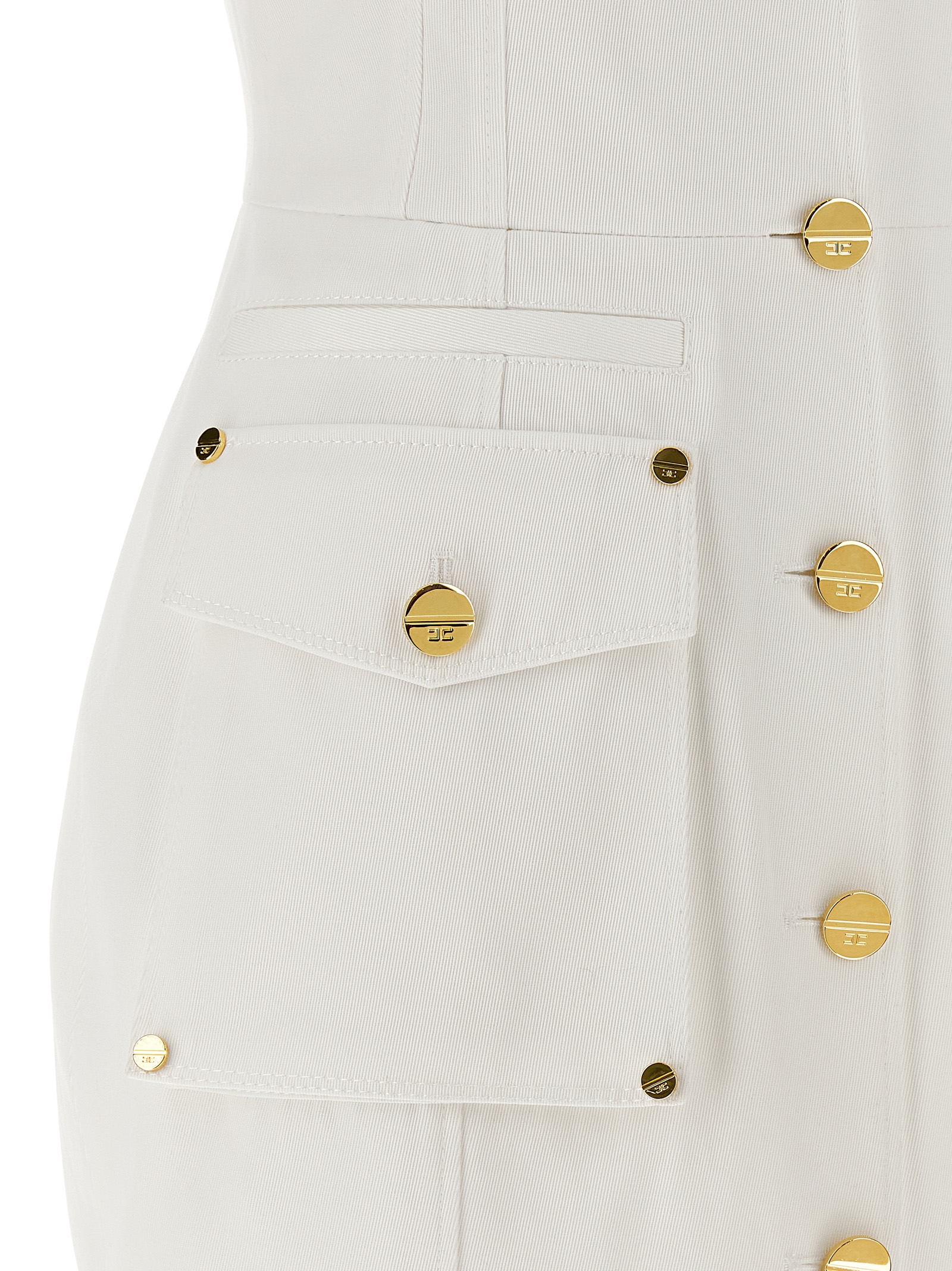 Double-breasted cotton gabardine mini dress with front button closure, lapel collar, structured shoulders with wings, pockets, back split, monogram satin lining.