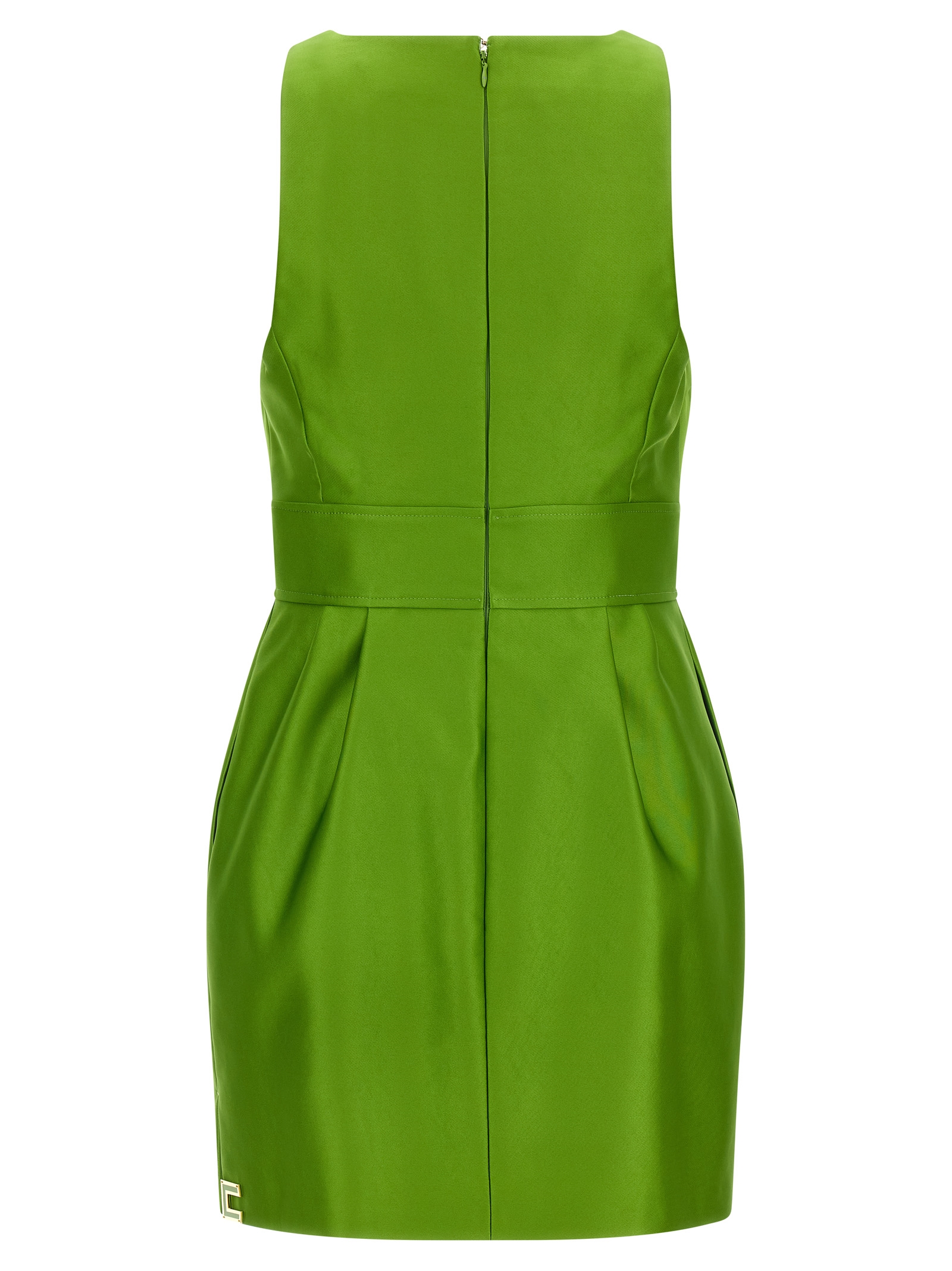 Duchesse mini dress, round neckline, draping on left shoulder, hourglass silhouette, side split with metal logo appliqué, sleeveless, pockets, back zip closure, satin lining.