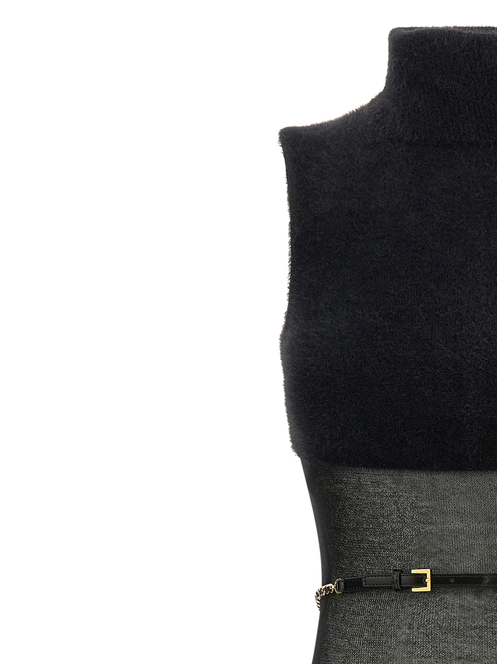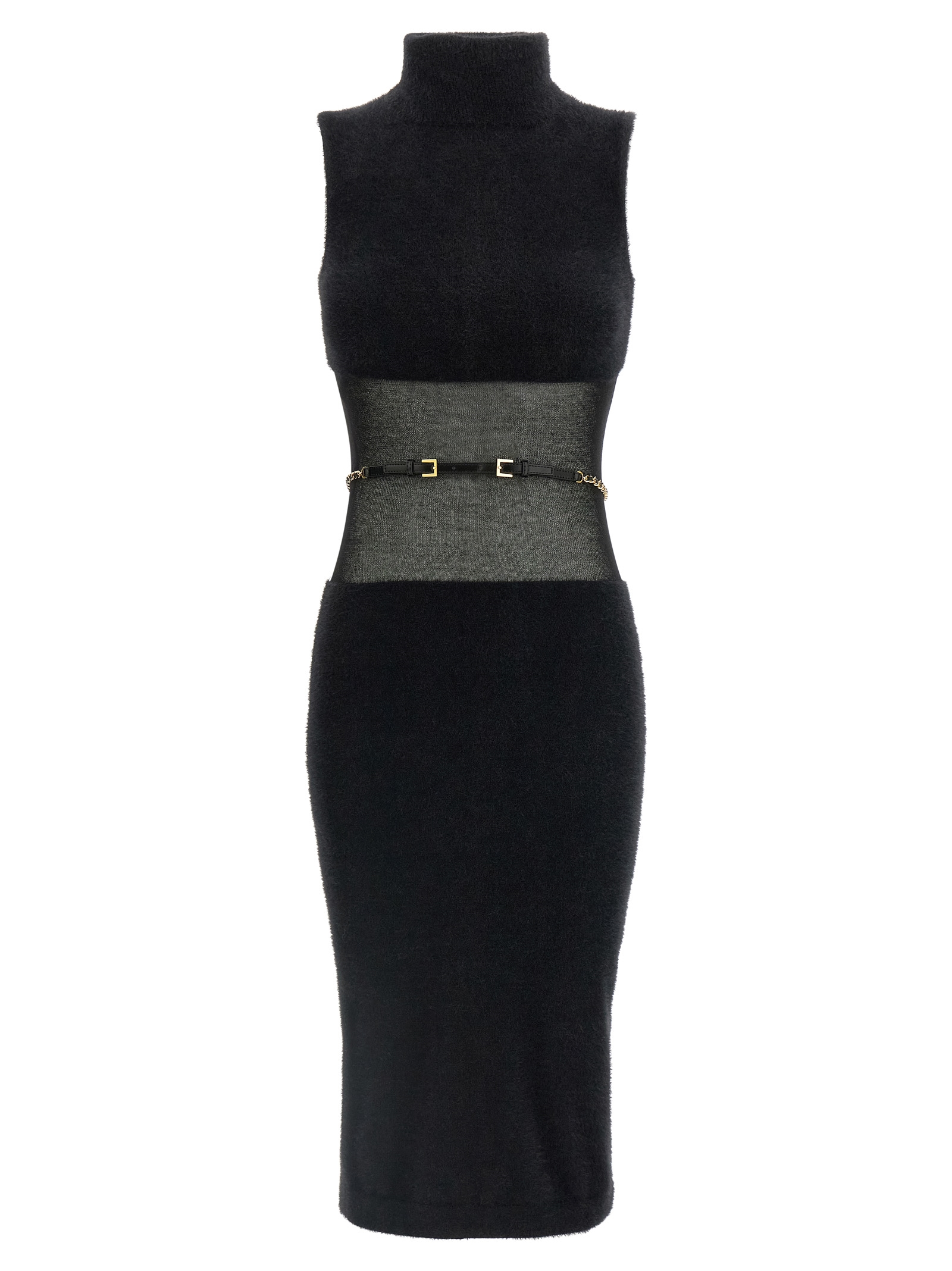 Fur-effect stretch knit midi dress with semi-transparent gauze insert at the waist, Sleeveless turtleneck neck, Longuette skirt, Removable belt.