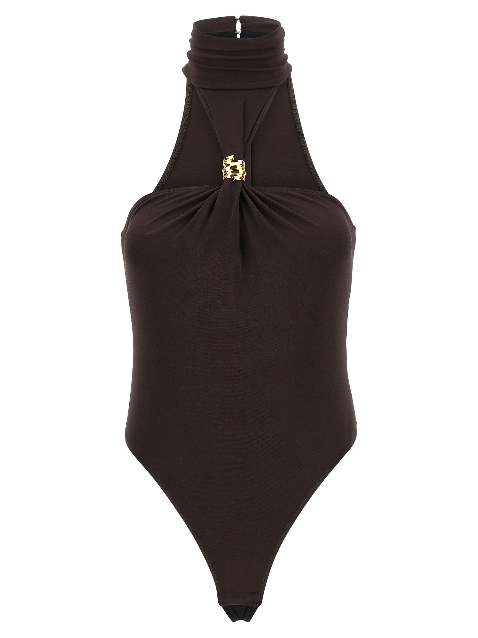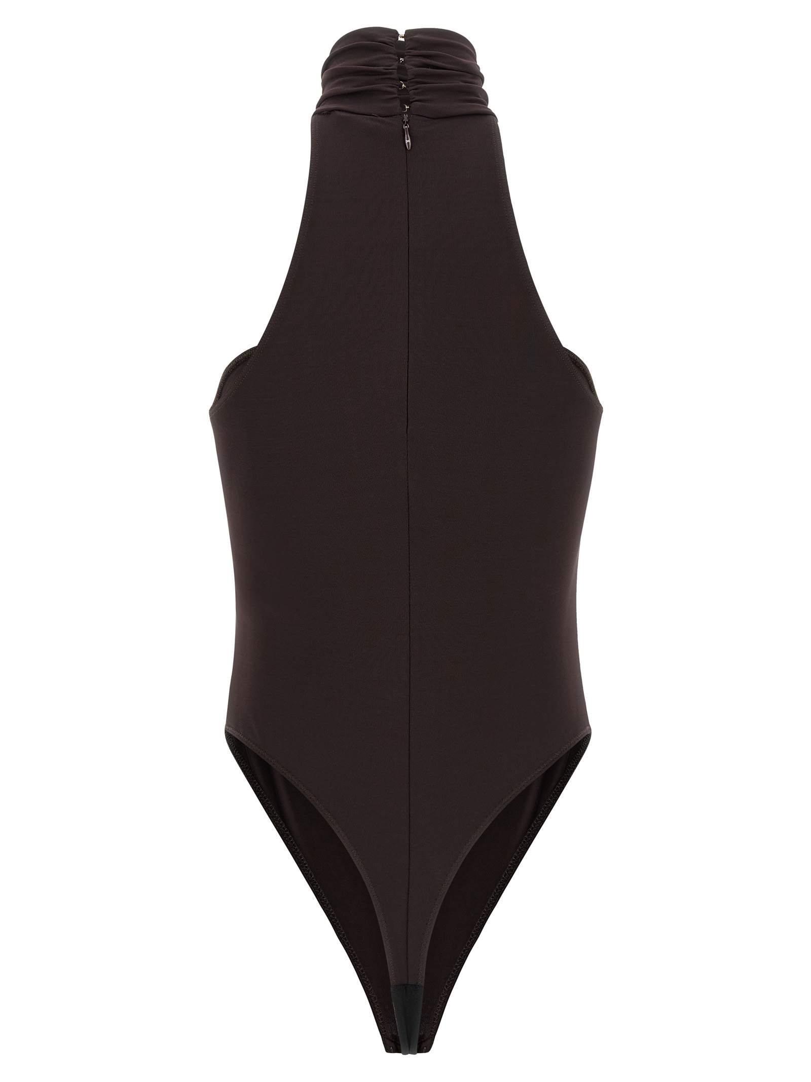 Jersey crêpe bodysuit with high neck, Rowing machine with metal jewel detail on the front, Back zip closure, High leg, Snap buttons on the hem, Knit lining.