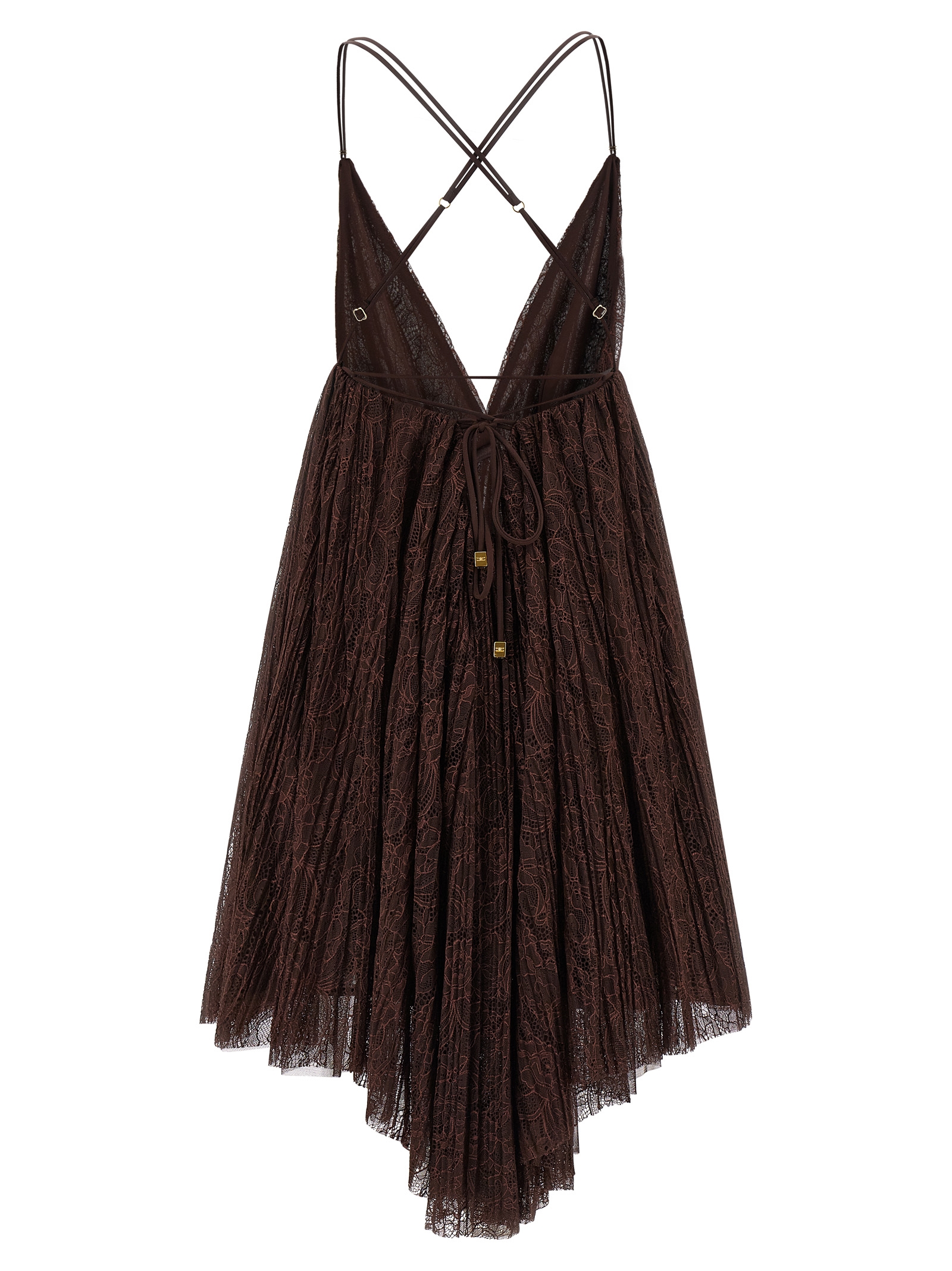 Pleated floral lace mini dress, Georgette lining, ‘baby doll’ inspired model with front and back neckline, Thin crossed and adjustable straps, Gold logo metal details, Back anodable lace closure.