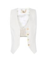 white, asymmetric cuts, double layer, straps rings, golden metal buttons, sleeveless. Linen blend vest.