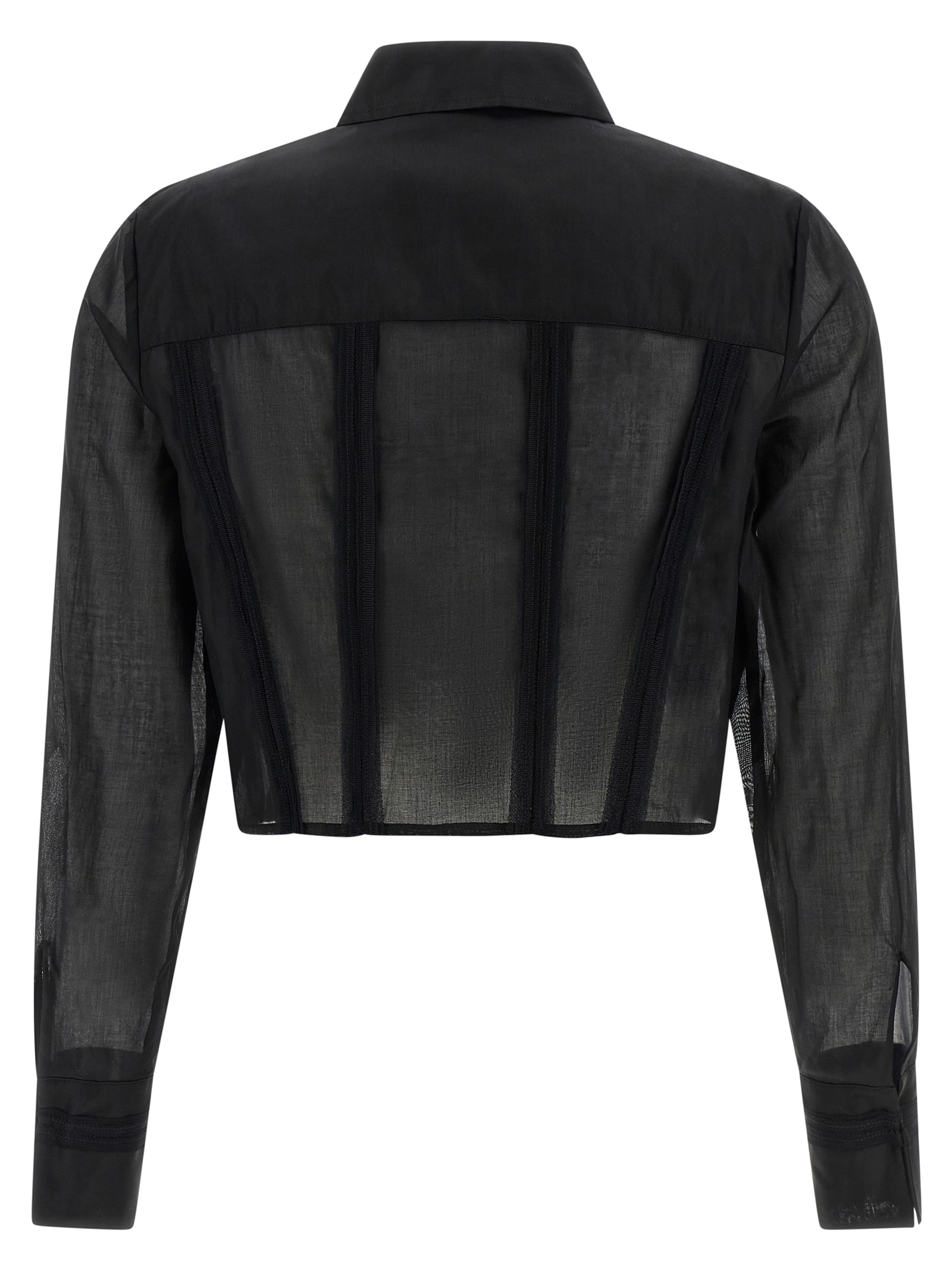 Semi-transparent light cotton shirt with tonal trimmings, crop model, maxi tone-on-tone logo embroidery, concealed front button closure, long cuffed sleeves.