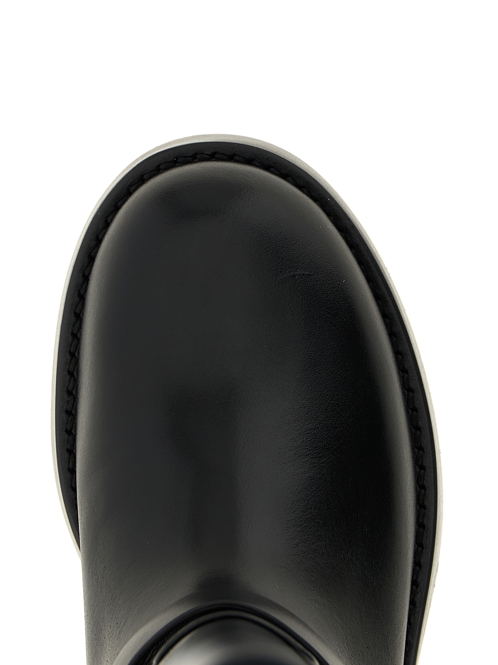 Leather boot, strap detail with metal plaque with engraved logo, rubber sole.