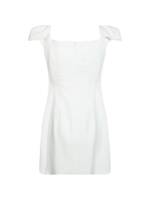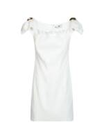 white, ring hardware, square neck, mini length, off-shoulder design, concealed zip fastening. Mini dress.