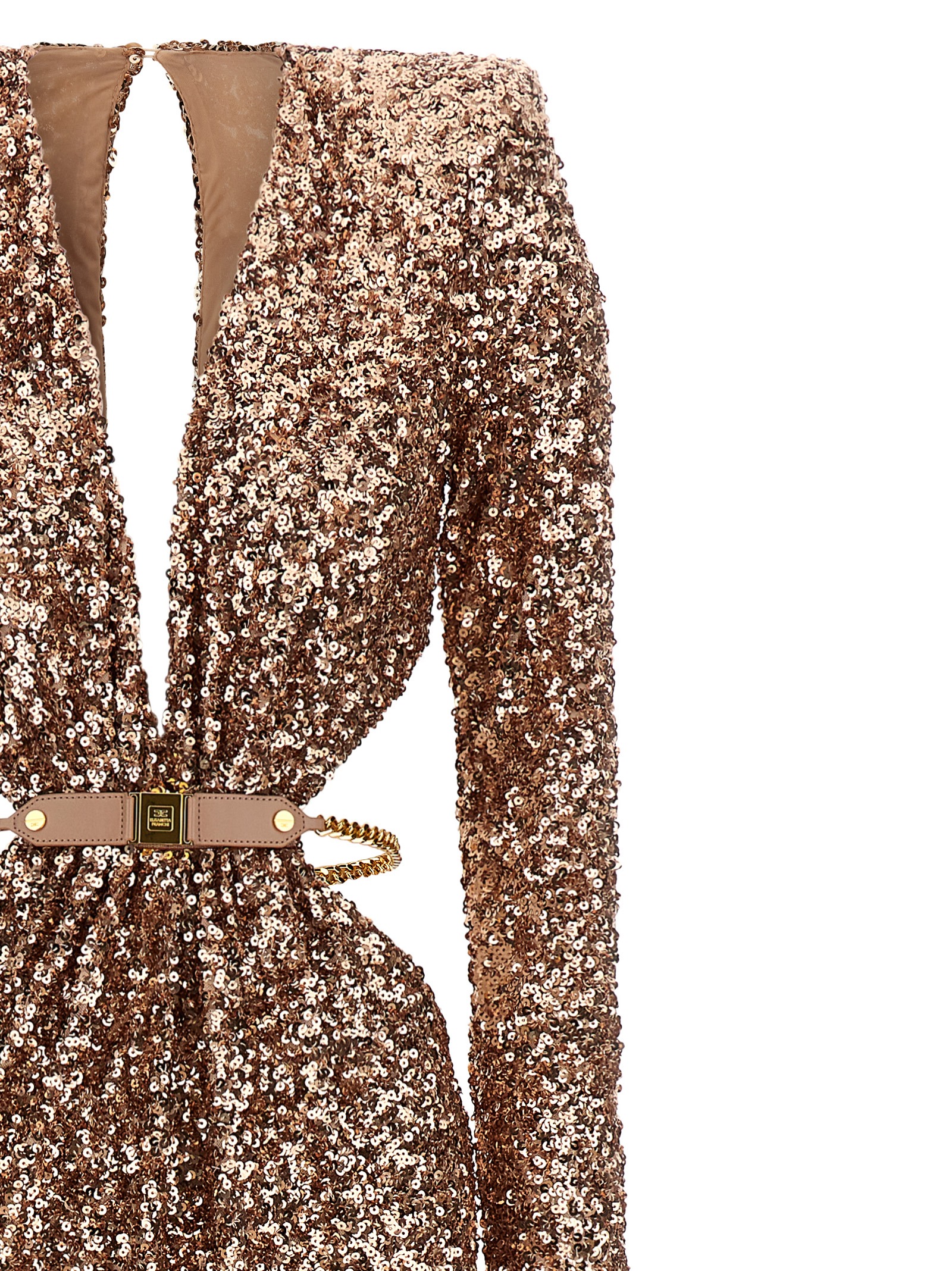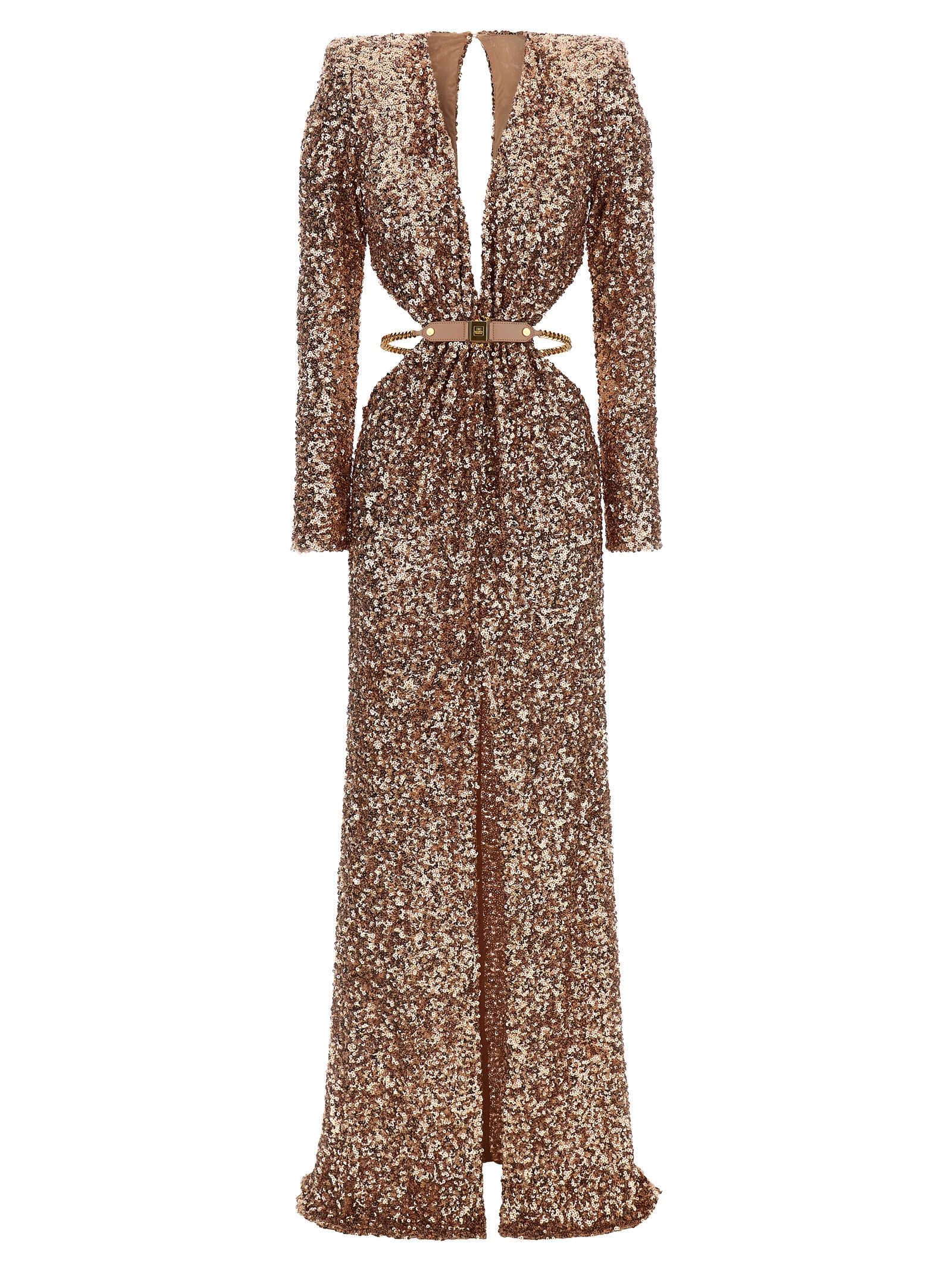 All-over sequined fabric Red Carpet dress, wide front V-neck, back button closure with teardrop cut-out detail, padded shoulders, long sleeves, side cut-out details, jewel chain belt with removable engraved logo, wide front slit, and knit lining.