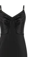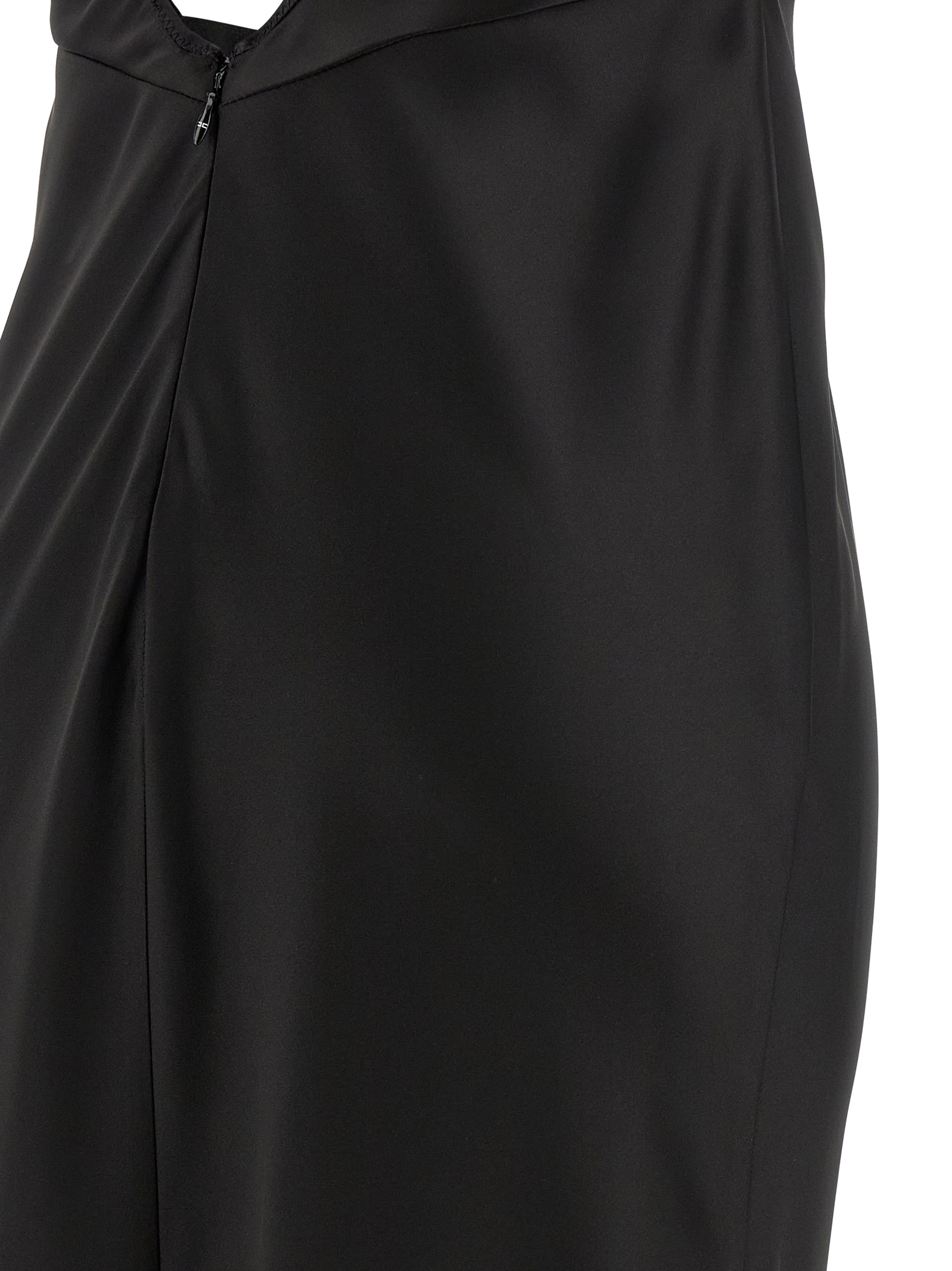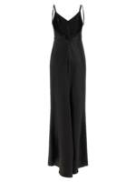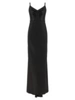 Long satin red carpet dress, Fitted fit, Front and back neckline, Thin straps with gold metal logo detailing, Front ruffles at the top, Back zip closure, Mermaid tail on the bottom. Size and Fit – True to size fit