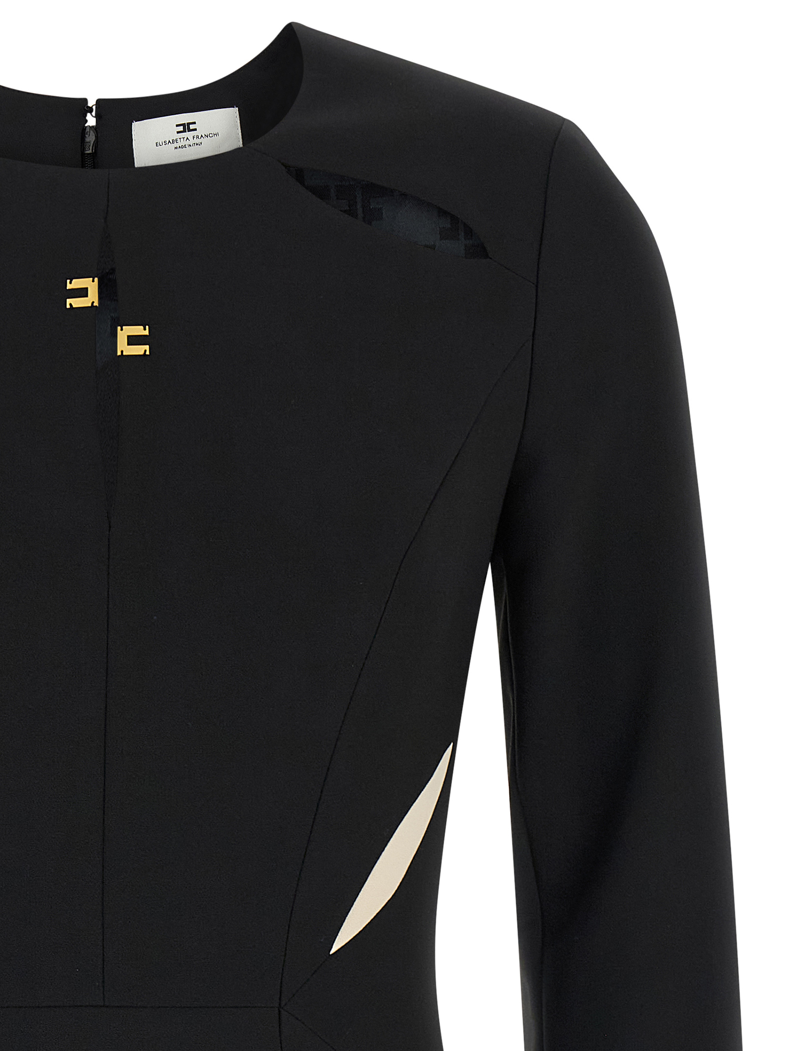 Sheath mini dress with crewneck with cut-out details at the top and contrasting inserts at the waist, Metal front detail with logo, Concealed zip back closure, And long sleeves.