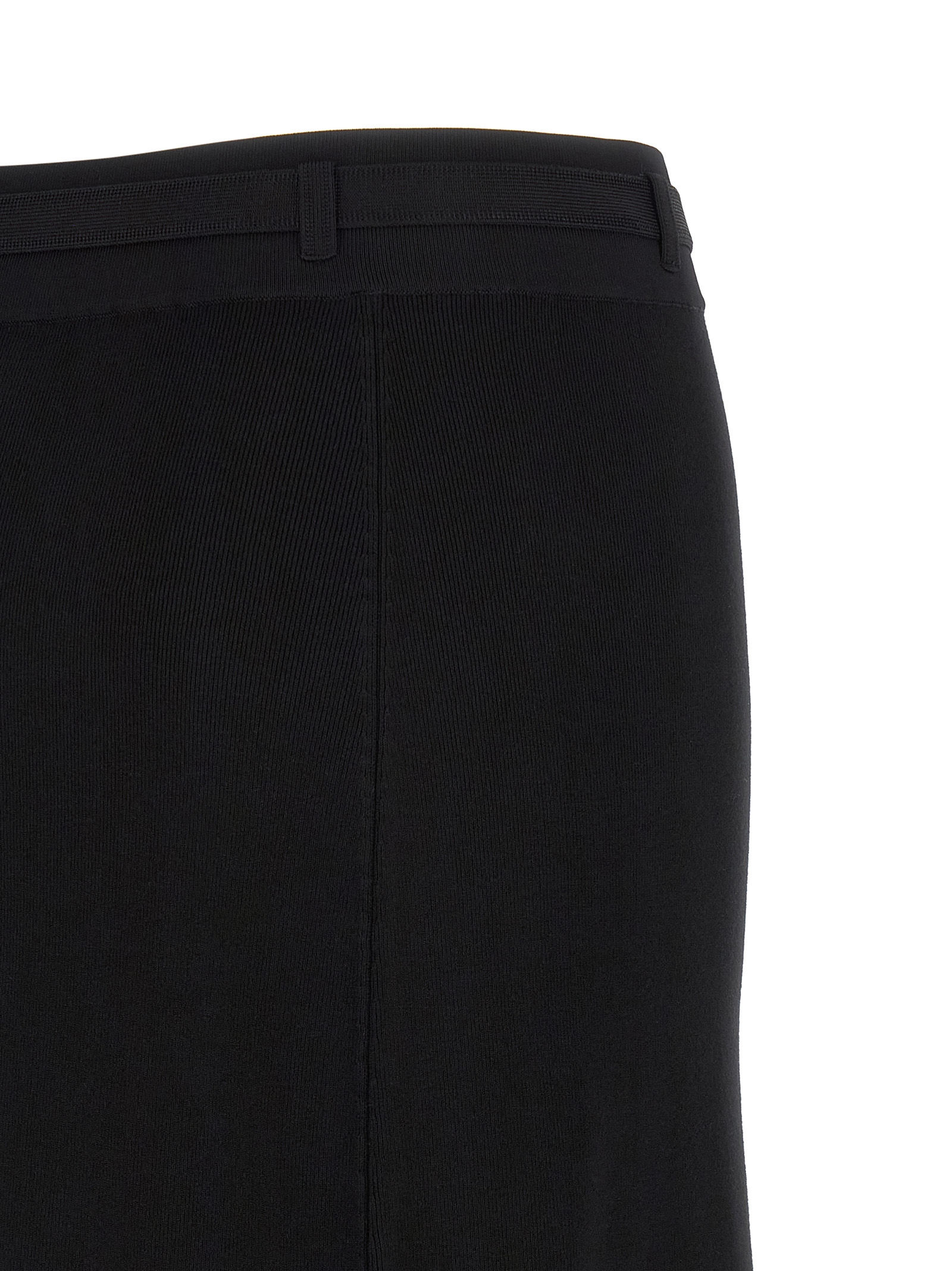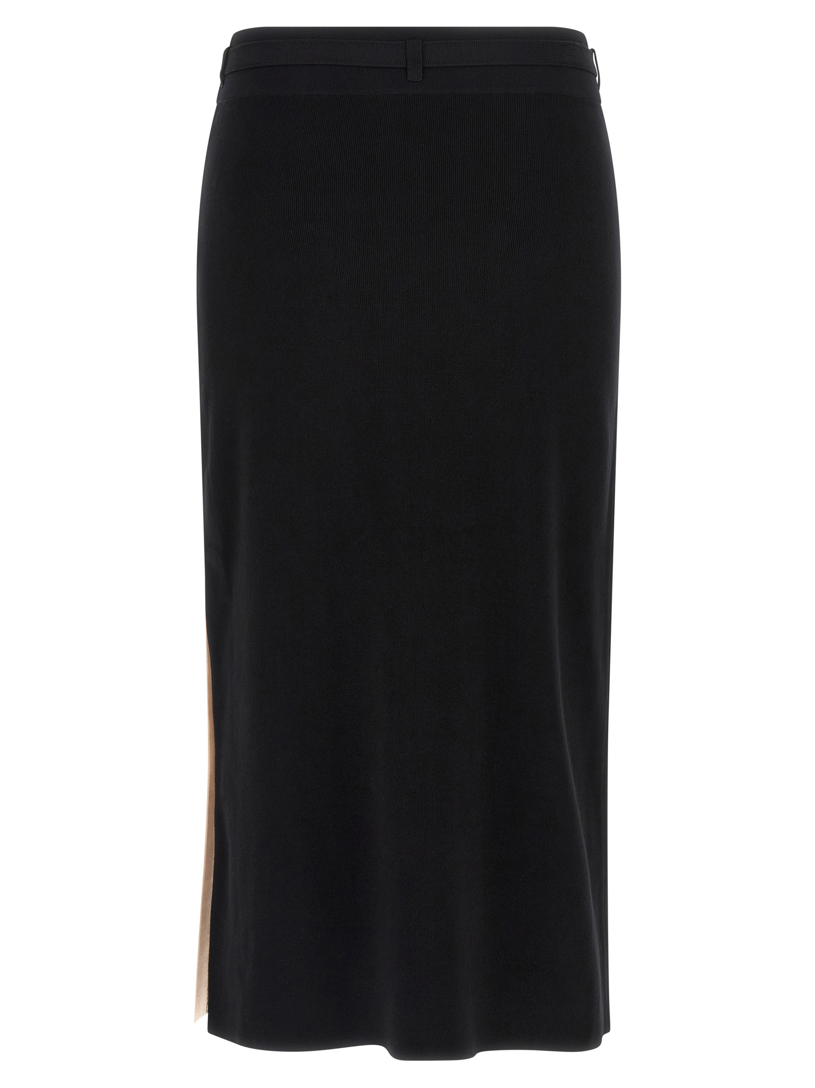 Midi knit skirt, Side band in shiny viscose with jacquard logo and jewel buttons, High waist, Elastic waistband with belt, Side split.