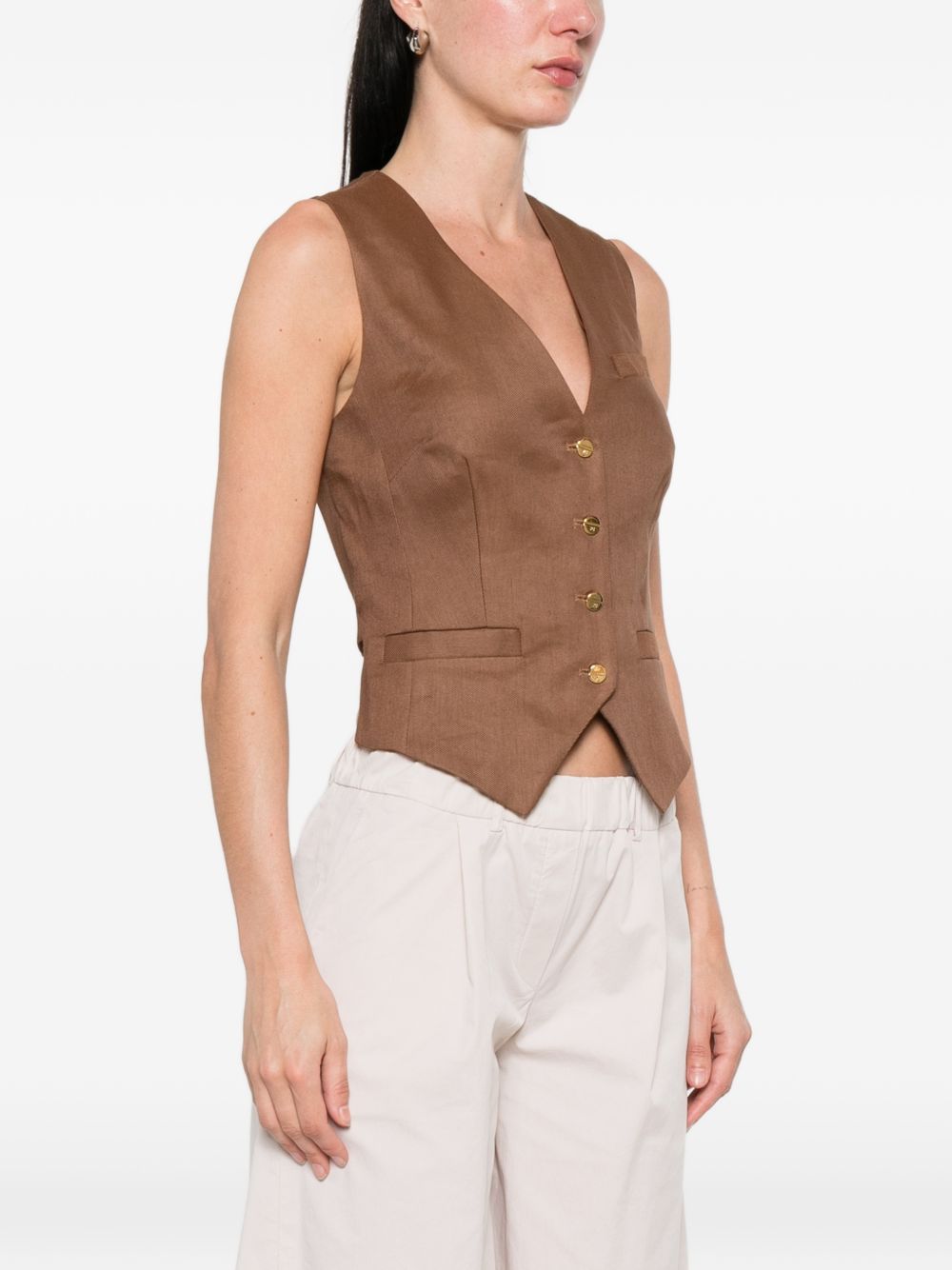 brown V-neck button fastening pockets Linen blend vest.