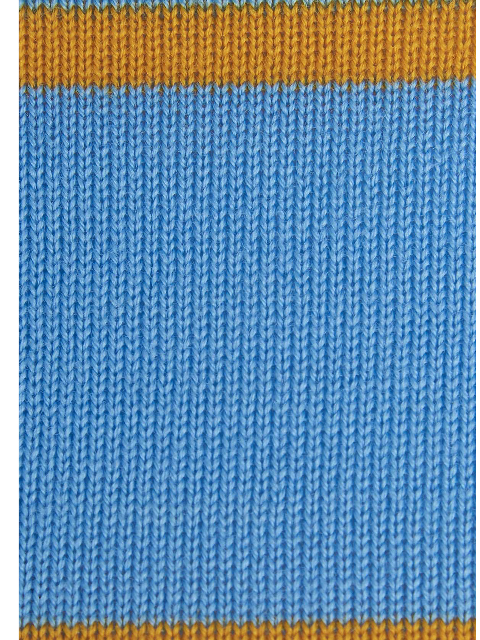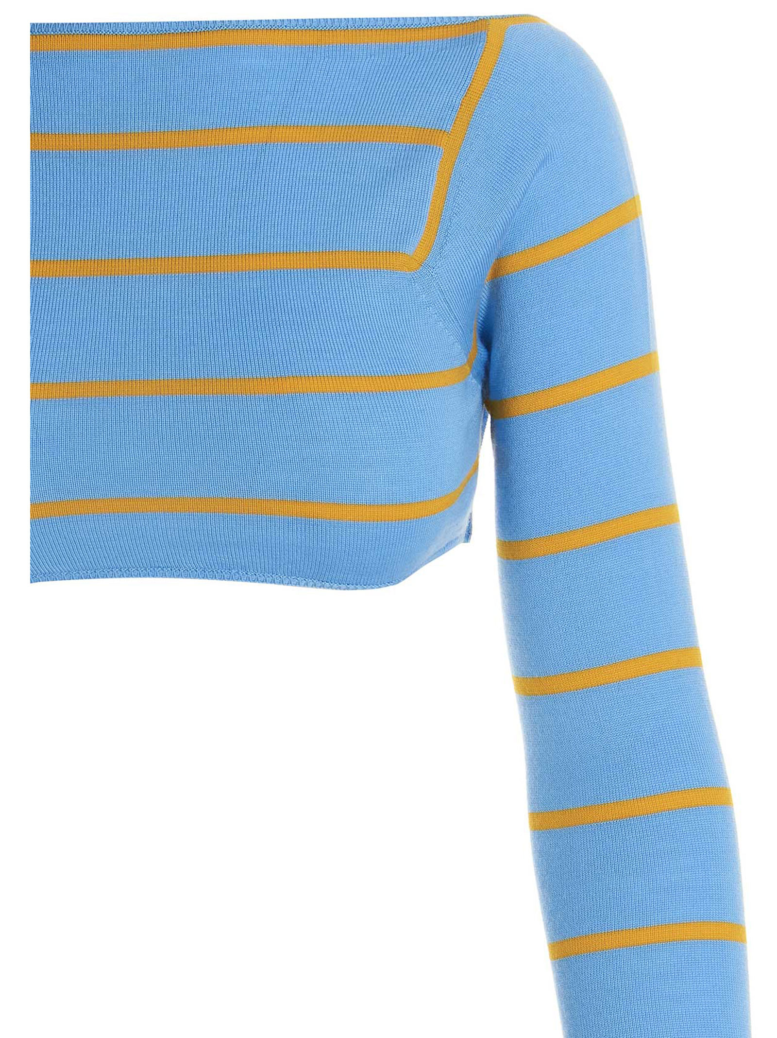 Cropped striped wool sweater with cut out detail on the back, printed silk elastic at the back, long sleeves, a crewneck.