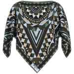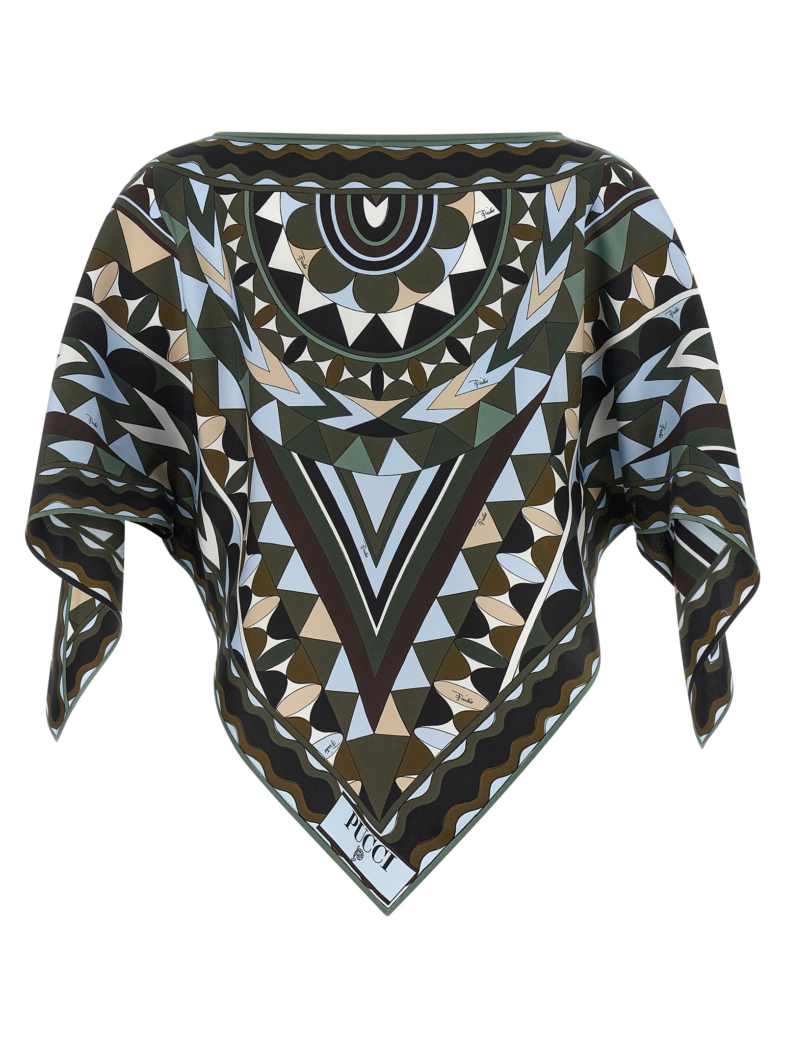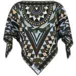 ‘manuba’ print silk twill top with cape silhouette, Caftan pattern, Boat neck, Short asymmetrical sleeves, And asymmetrical hem.