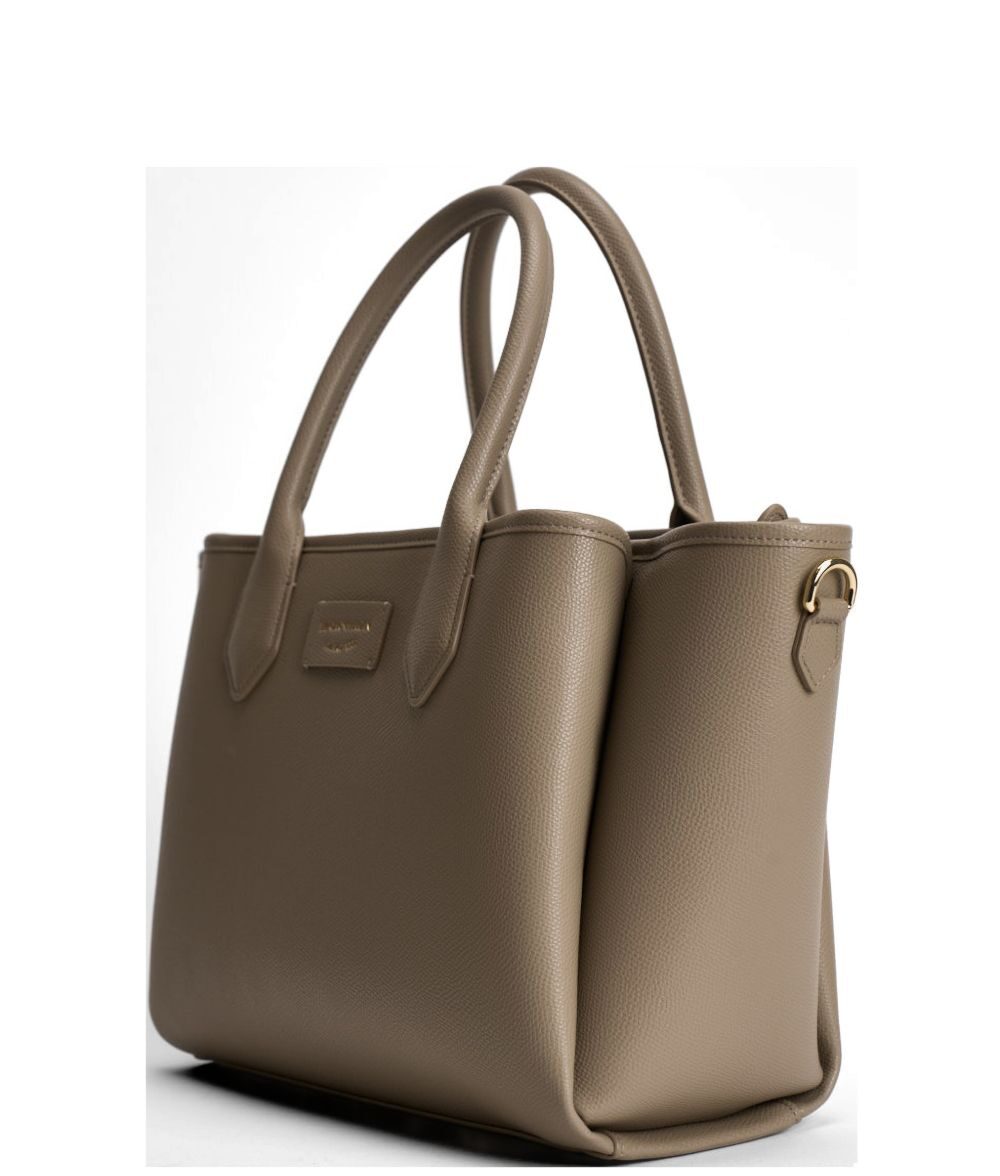taupe grained texture top handles gold-tone logo plaque tonal stitching rectangular shape Medium shopping bag
