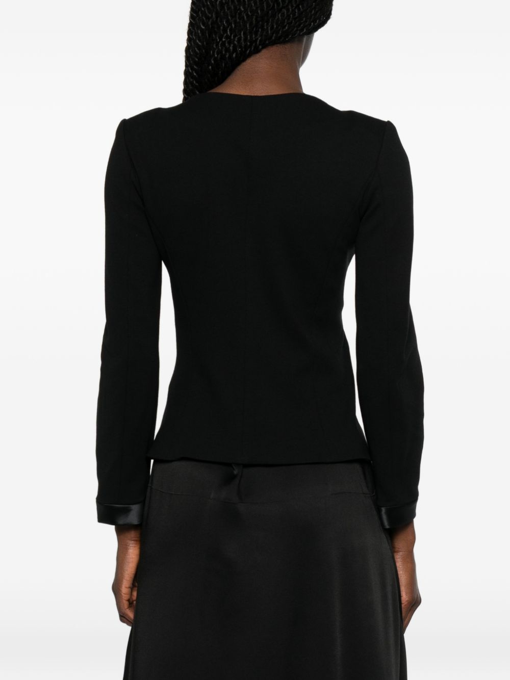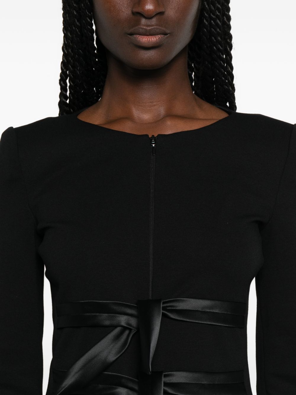 black collarless round neck front zip fastening long sleeves bow detail satin-finish cuffs Bow-detail collarless jacket.