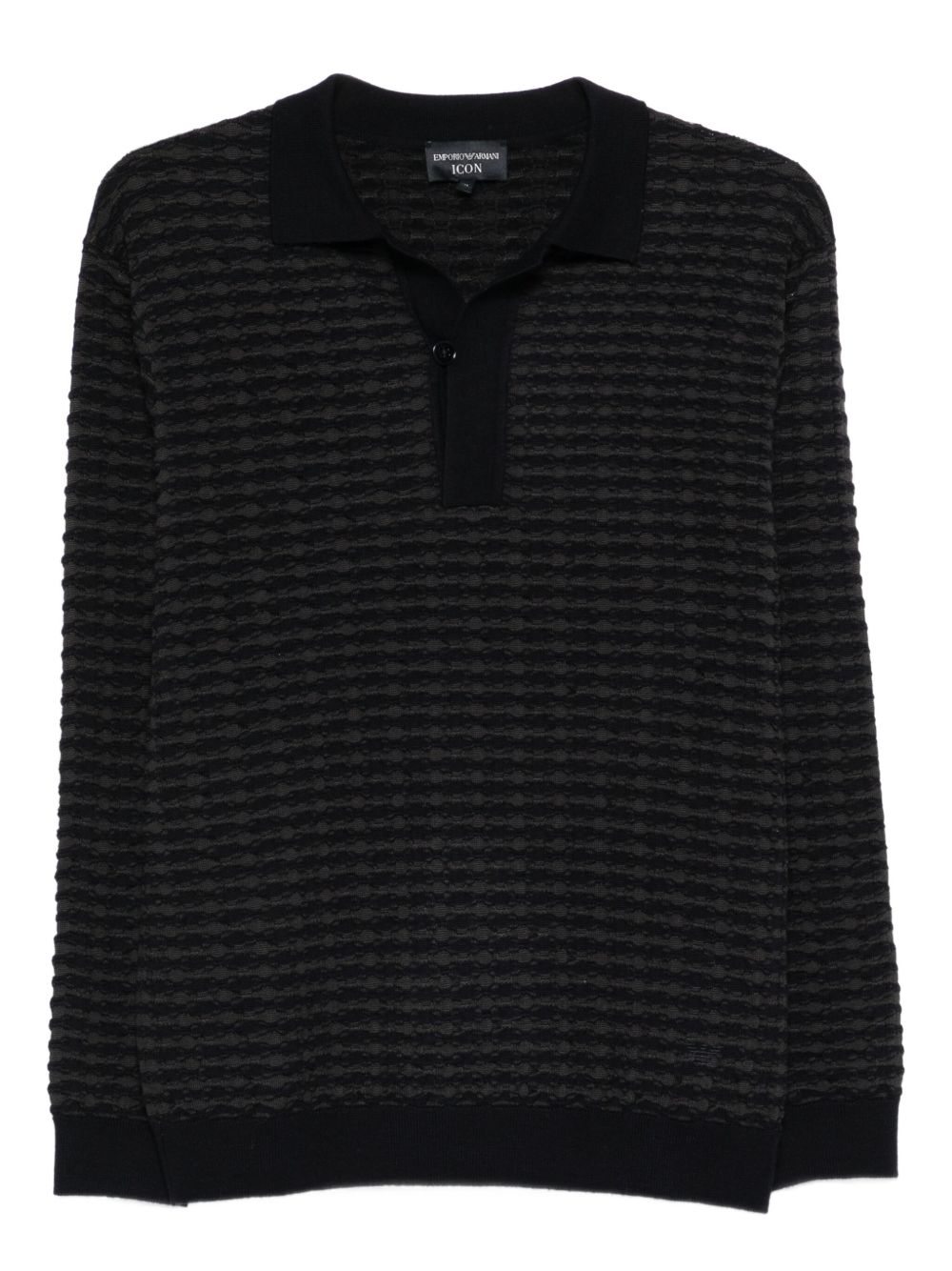 blue wool long sleeves ribbed texture polo collar button fastening Wool polo shirt
