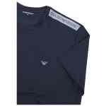 Blue top, short sleeves, straight hem, crew neck, logo on the chest and shoulders.