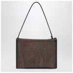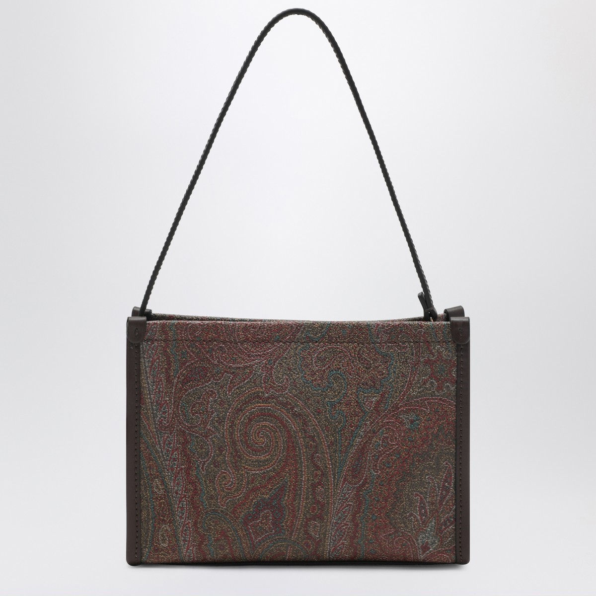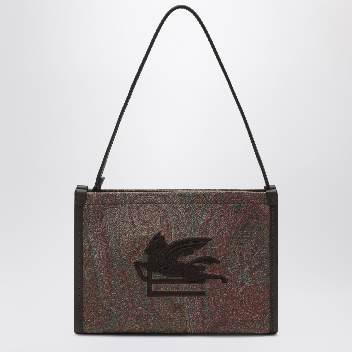 Etro pouch made from Paisley jacquard fabric with leather details, featuring embroidered logo and Pegasus on the front, contrasting striped jacquard fabric lining, zip closure, removable handle, applied internal pocket, and gold-tone metal hardware.
