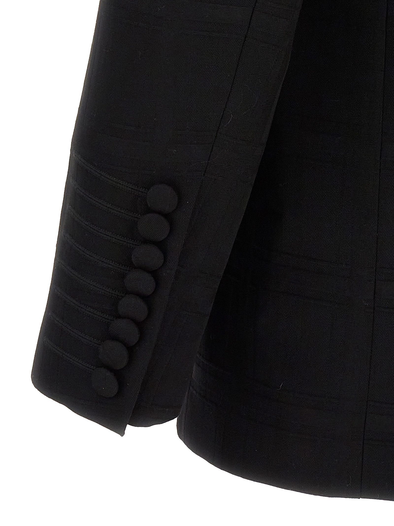Check double-breasted wool blazer with button closure, pockets, long sleeves.