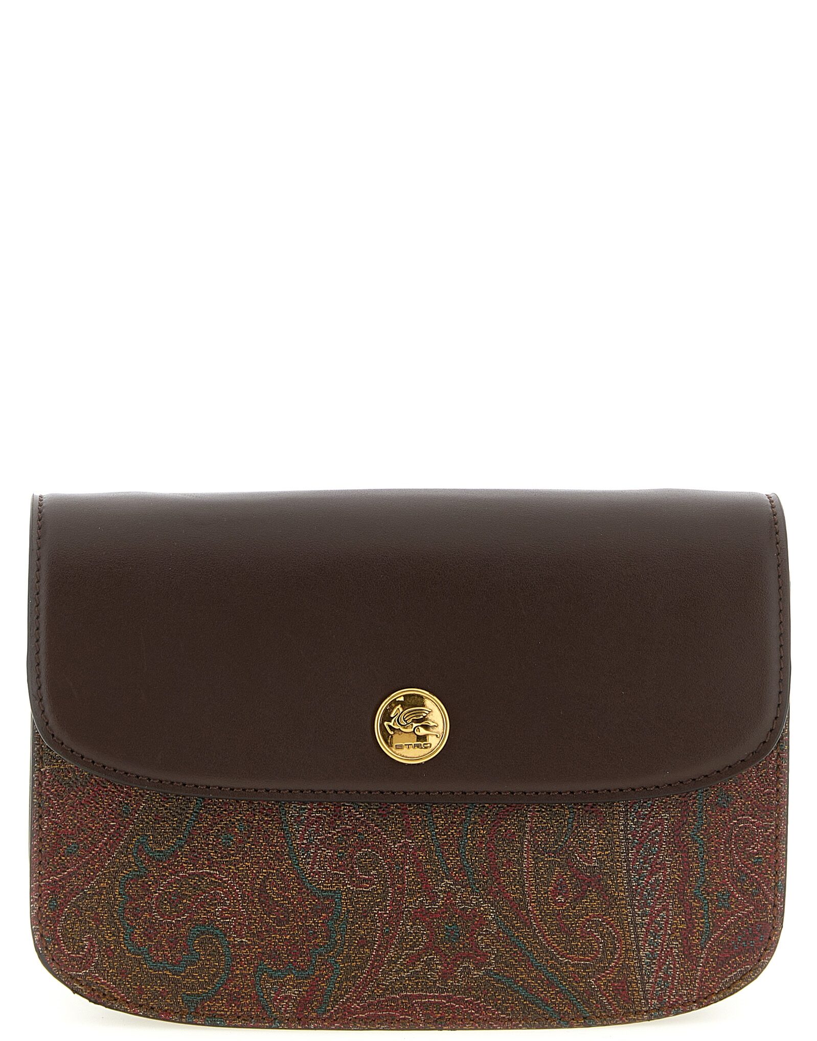 ‘Etro Essential S’ crossbody bag in ‘Arnica’ Paisley jacquard canvas, leather and suede, magnetic flap closure with metal button with engraved logo, back pocket, adjustable and removable shoulder strap.