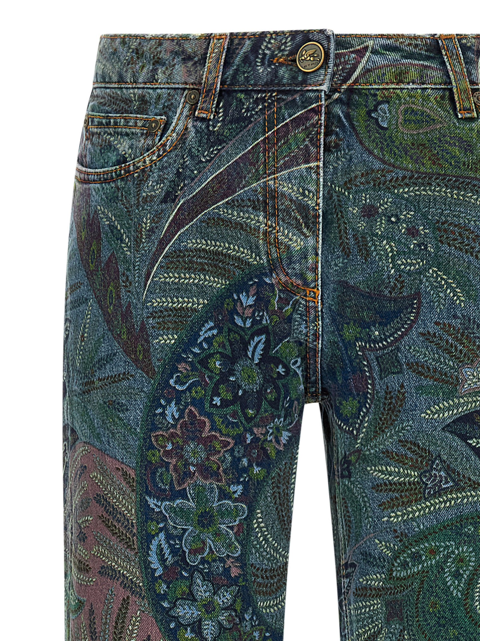 All-over floral print pure cotton denim jeans, Contrast stitching, Mid waist, Flared leg, Front zip and button closure, Five pockets, Leather logo tag with embossed logo on the back. Size and Fit – true to size fit
