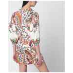 White cotton blouse by Etro with multicolour paisley print, featuring a crew neck with front V-slit and three-quarter-length balloon sleeves.