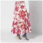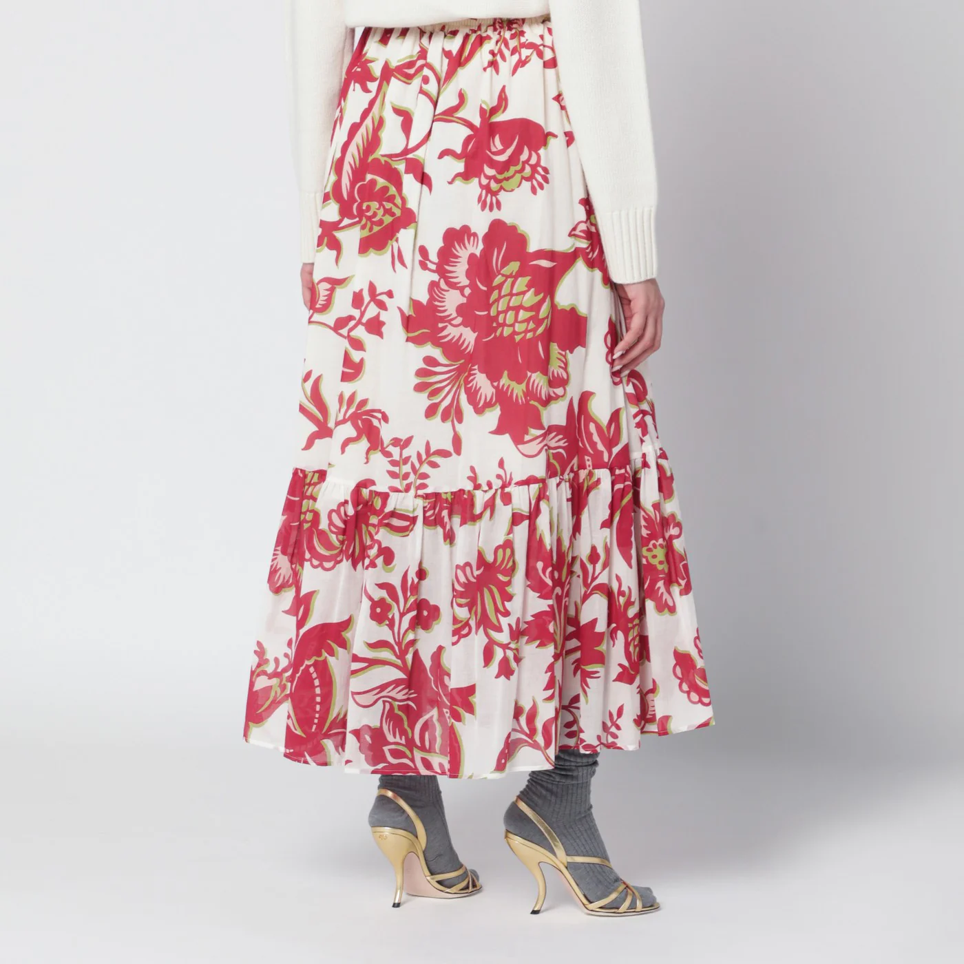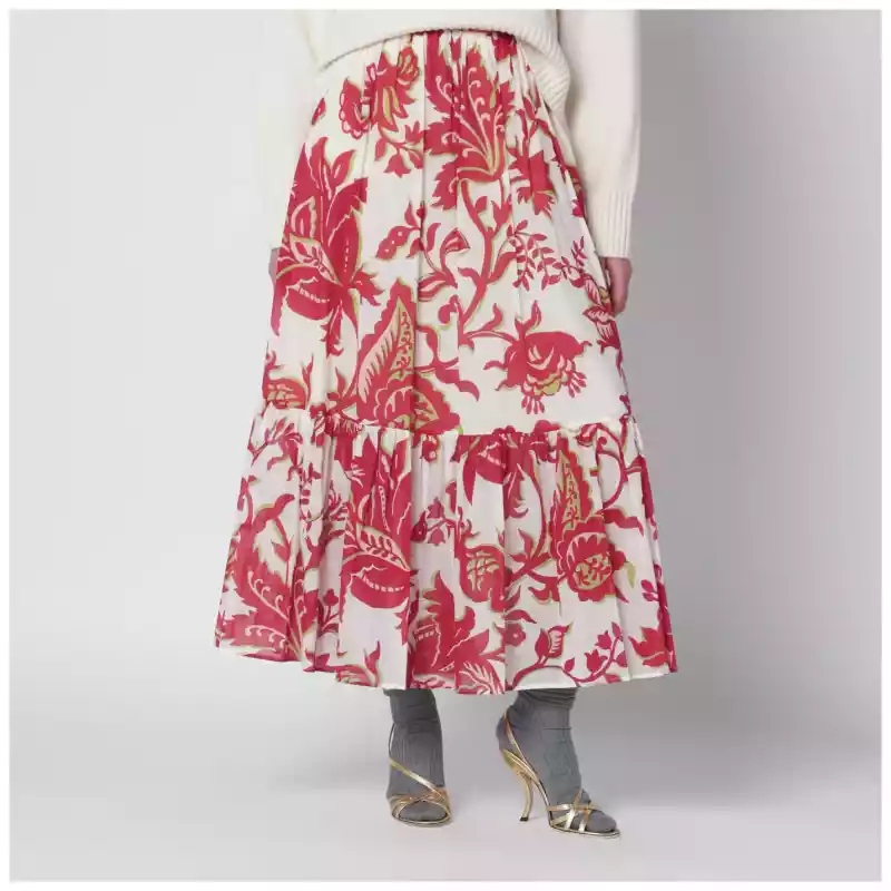 Full skirt by Etro in white cotton all over red floral print two side pockets elasticated back waist. Size and Fit – Model wears size 40 IT Model measurements: Height: 178 cm Chest: 83 cm Waist: 63 cm Hips: 91 cm