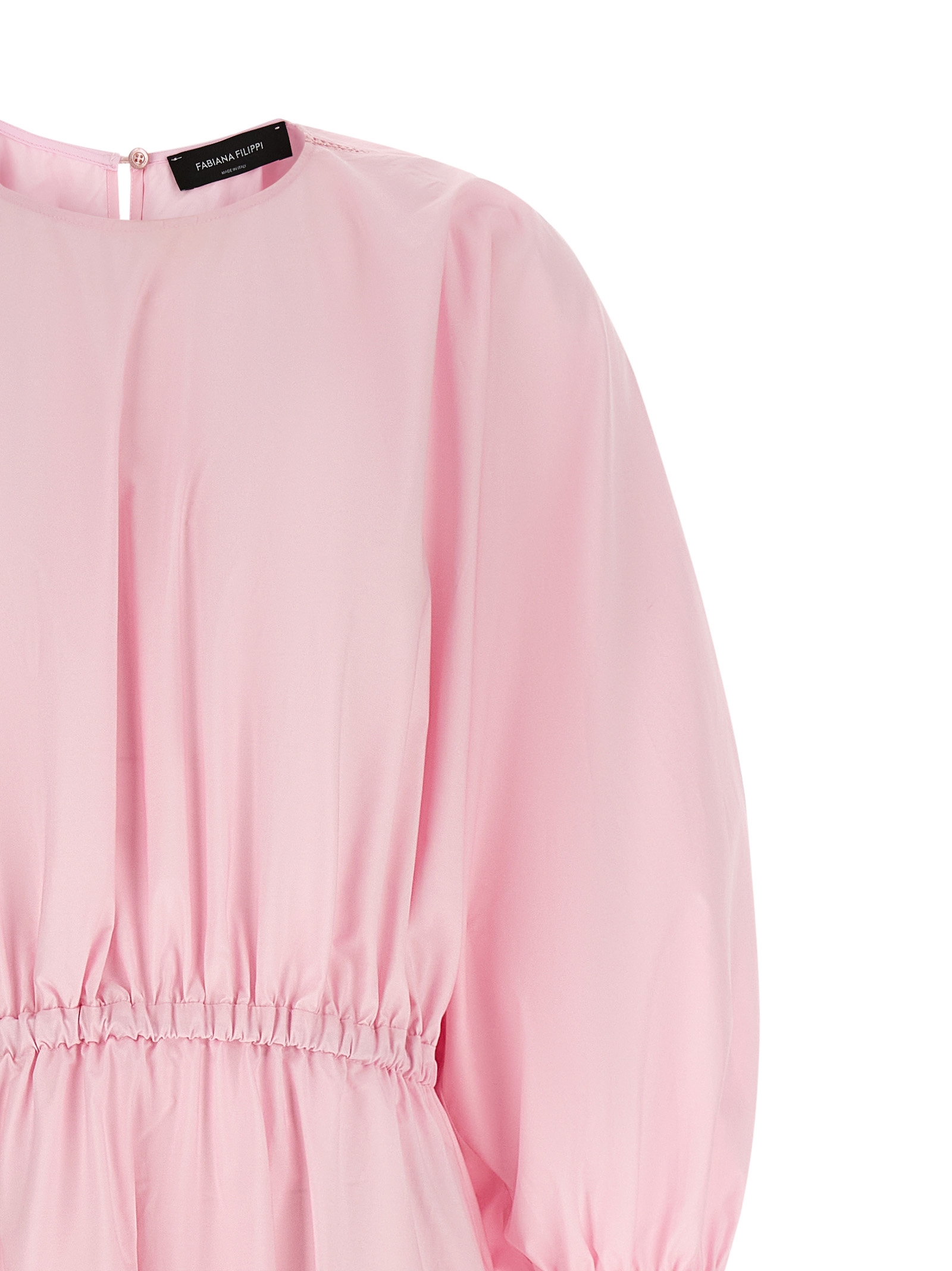 Long dress in cotton poplin with openwork embroidery with diamond thread on the shoulder and sleeve, hourglass silhouette with elastic waistband, round neckline with back button closure and cut-out teardrop detail, long sleeves with elastic cuffs, pockets.