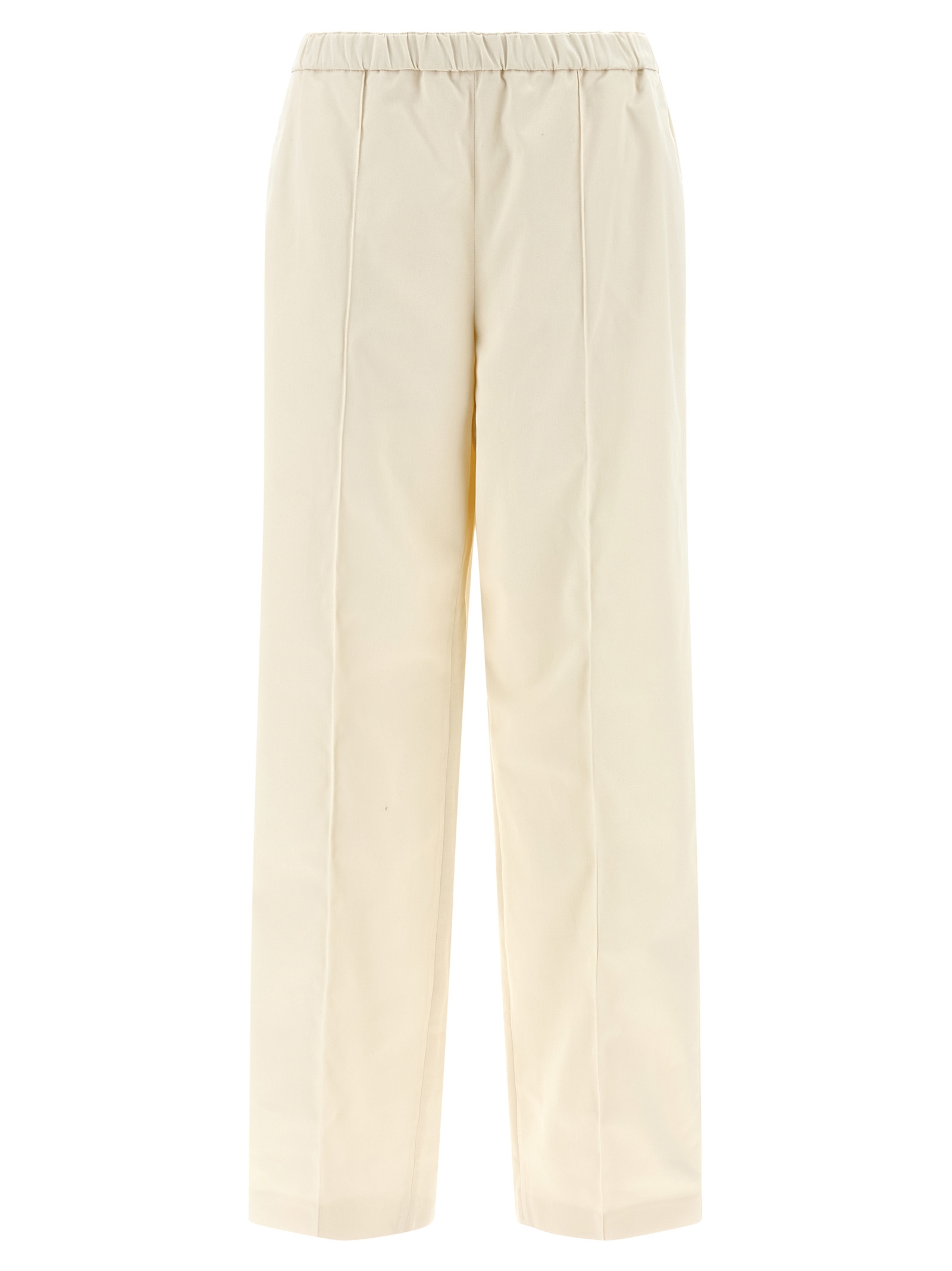 Cotton gabardine trousers, straight leg with central stitching, elastic waistband, pockets, diamond detail at the back.