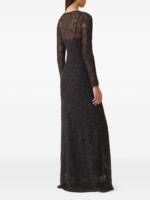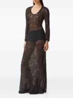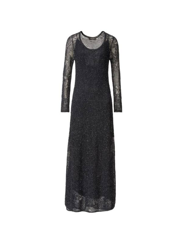 black, lace overlay, round neck, long sleeves, maxi length, open knit. Lace long dress.