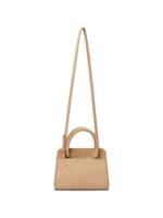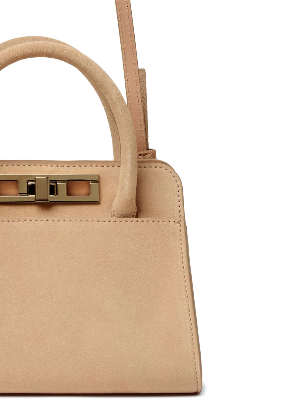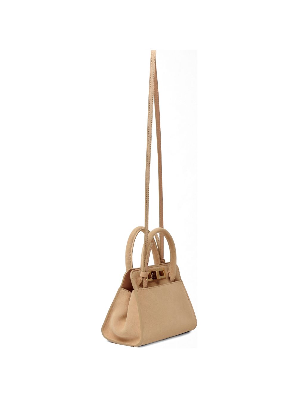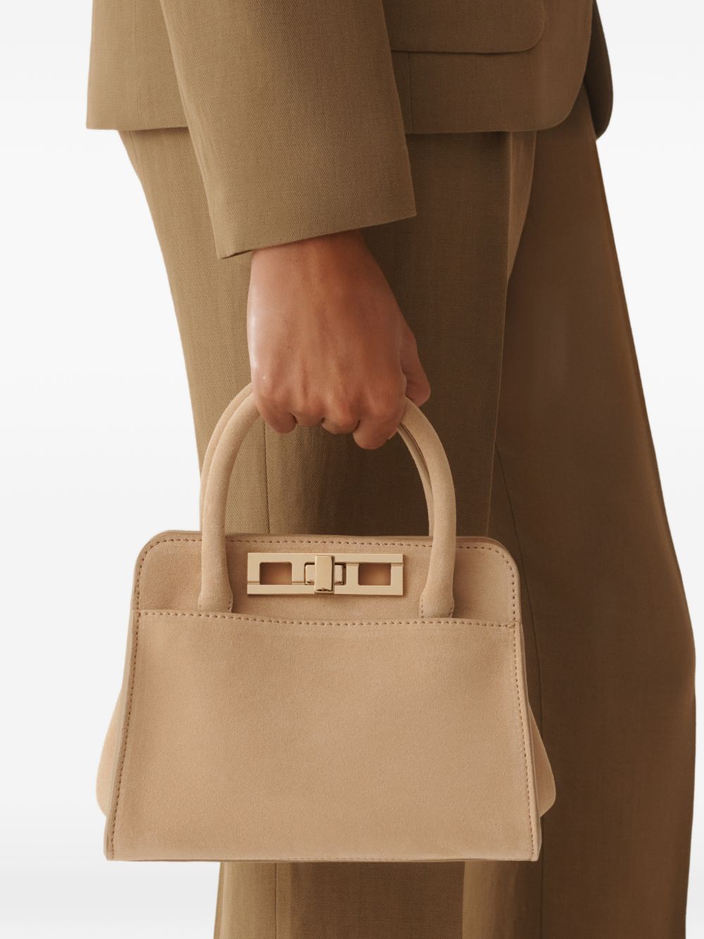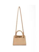 beige top rolled handles detachable adjustable shoulder strap turn-lock closure suede Leather handbag.