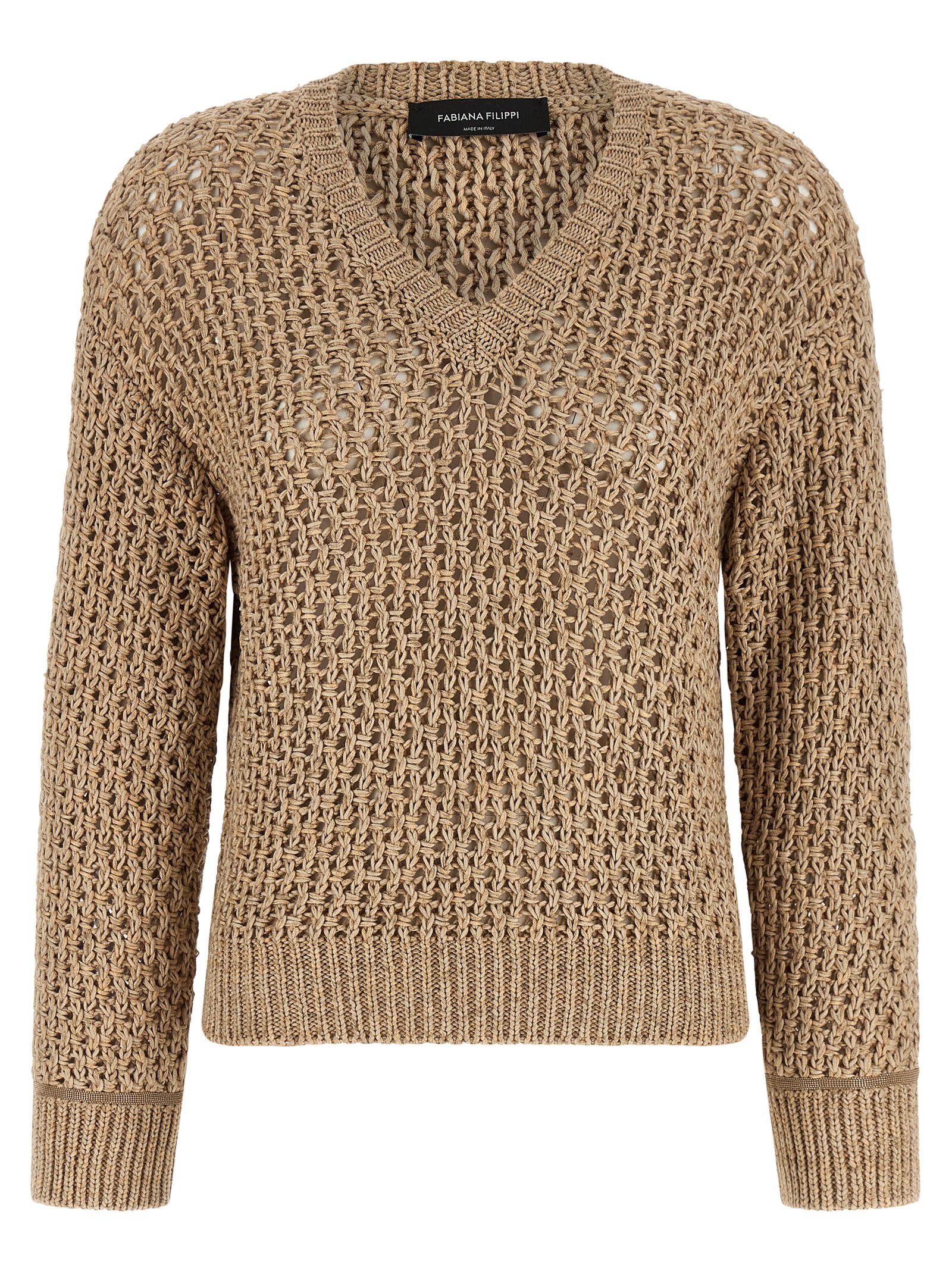 Mouliné yarn sweater worked in bark stitch mixed with cotton tape, V-neck, long sleeves with cuffs and dropped shoulder, band on the hem.