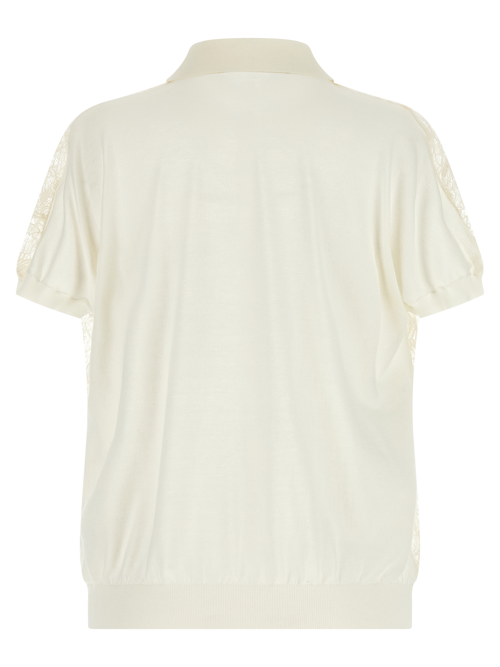 Silk and cotton blend cardigan with semi-transparent organza lace front, Shirt collar, Front hidden snap button closure, Short cuffed sleeves, And headband on the hem.