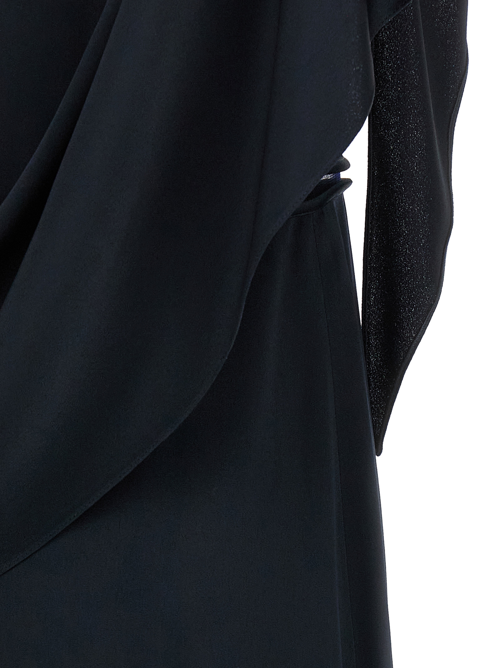 Silk-effect fabric midi dress, crew neck, cut-out details with transparent mesh, ruffle sleeves joined by a back sash, back zip closure, asymmetrical length.