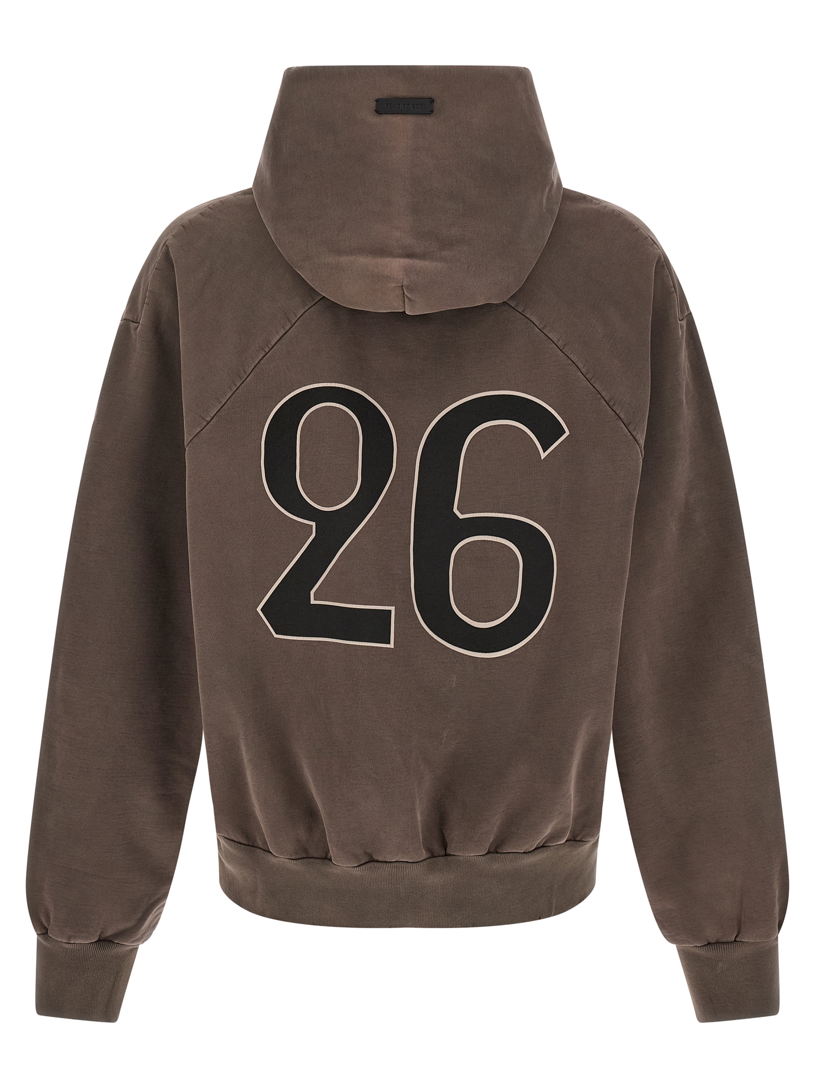 ’26 classic half raglan’ hoodie in heavy used-effect cotton sweatshirt finished with a garment wash and sun discoloration treatment, Graphic print by hand on the front and back, Long sleeves with cuffs and dropped shoulders, Logo patch at the back and back in half raglan, Band on the hem. Size and Fit – Classic fit