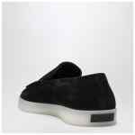 Fear of God loafers in black suede, featuring almond toe and contrasting rubber sole with black logo label on the back.