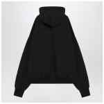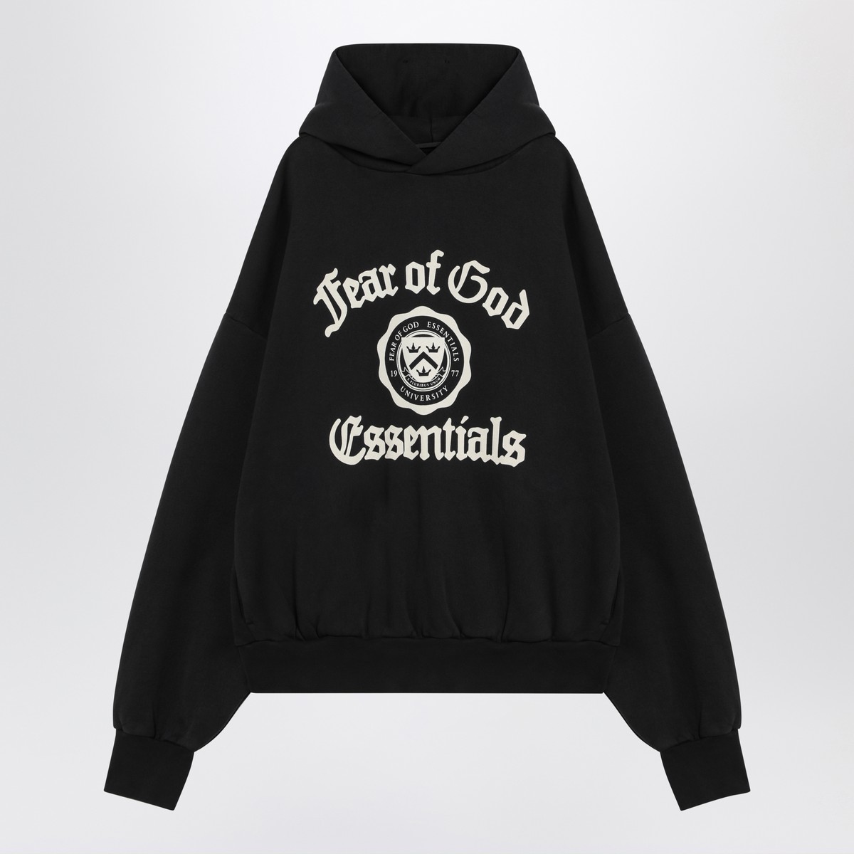 Black cotton hoodie from Fear Of God Essentials, featuring long sleeves, a hood with a rubberized logo patch on the back, ribbed edges, two side welt pockets, and a contrasting University crest logo on the front.